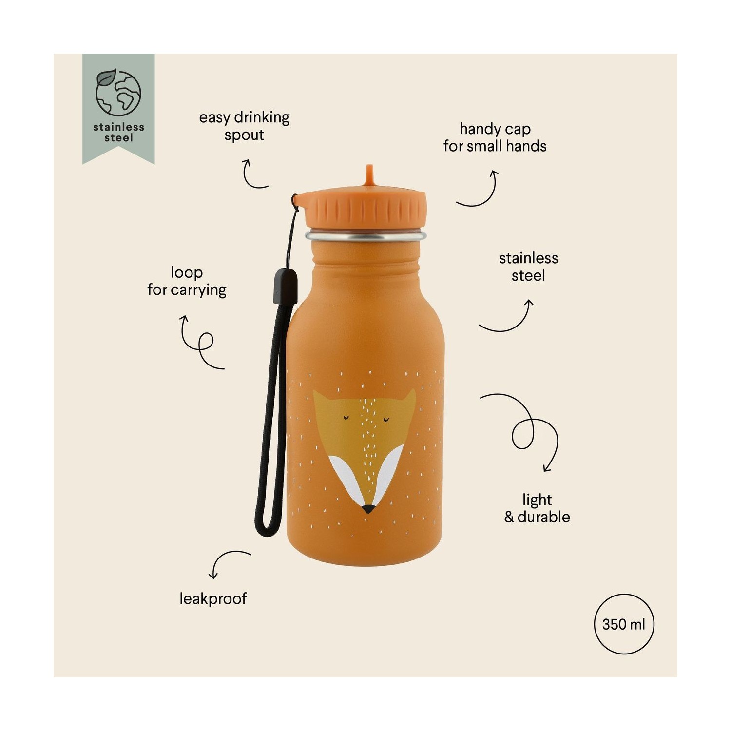 Las botellas son completamente a prueba de fugas. La tapa práctica está diseñada para que las manos pequeñas puedan abrirla y cerrarla fácilmente. Cada botella está equipada con una cuerda con la que puedes transportarla fácilmente o colgarla en una mochila. Cada animal está disponible en 2 tamaños. La botella pequeña tiene un volumen de 350ml, la grande de 500 ml. Ambas botellas tienen un diseño fino para que se adapte bien a las manos de los niños pequeños y se pueda guardar fácilmente en la mochila o en la mochila escolar. La botella viene con una tapa.
