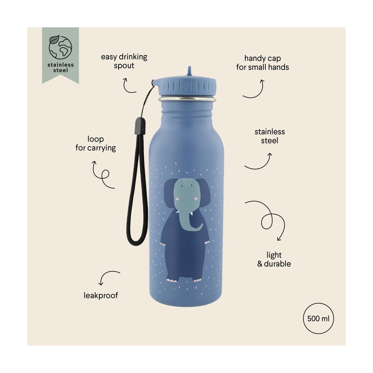 Las botellas son completamente a prueba de fugas. La tapa práctica está diseñada para que las manos pequeñas puedan abrirla y cerrarla fácilmente. Cada botella está equipada con una cuerda con la que puedes transportarla fácilmente o colgarla en una mochila. Cada animal está disponible en 2 tamaños. La botella pequeña tiene un volumen de 350ml, la grande de 500 ml. Ambas botellas tienen un diseño fino para que se adapte bien a las manos de los niños pequeños y se pueda guardar fácilmente en la mochila o en la mochila escolar. La botella viene con una tapa., botella: 100% acero inoxidable - tapa: 100% PP - cuerda: 100% PES, limpiar a mano con agua tibia y jabón