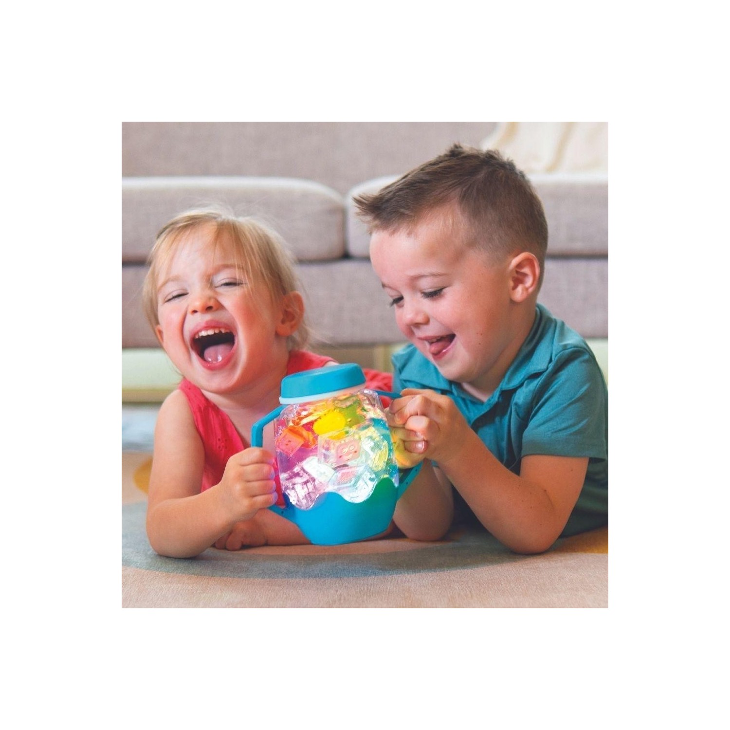 La Jarra sensorial amarilla Glopals con su luz multicolor y su fácil apagado y encendido es una forma perfecta de estimular la creatividad y la diversión sensorial, así como de regular el control de sus emociones cual botella de la calma
