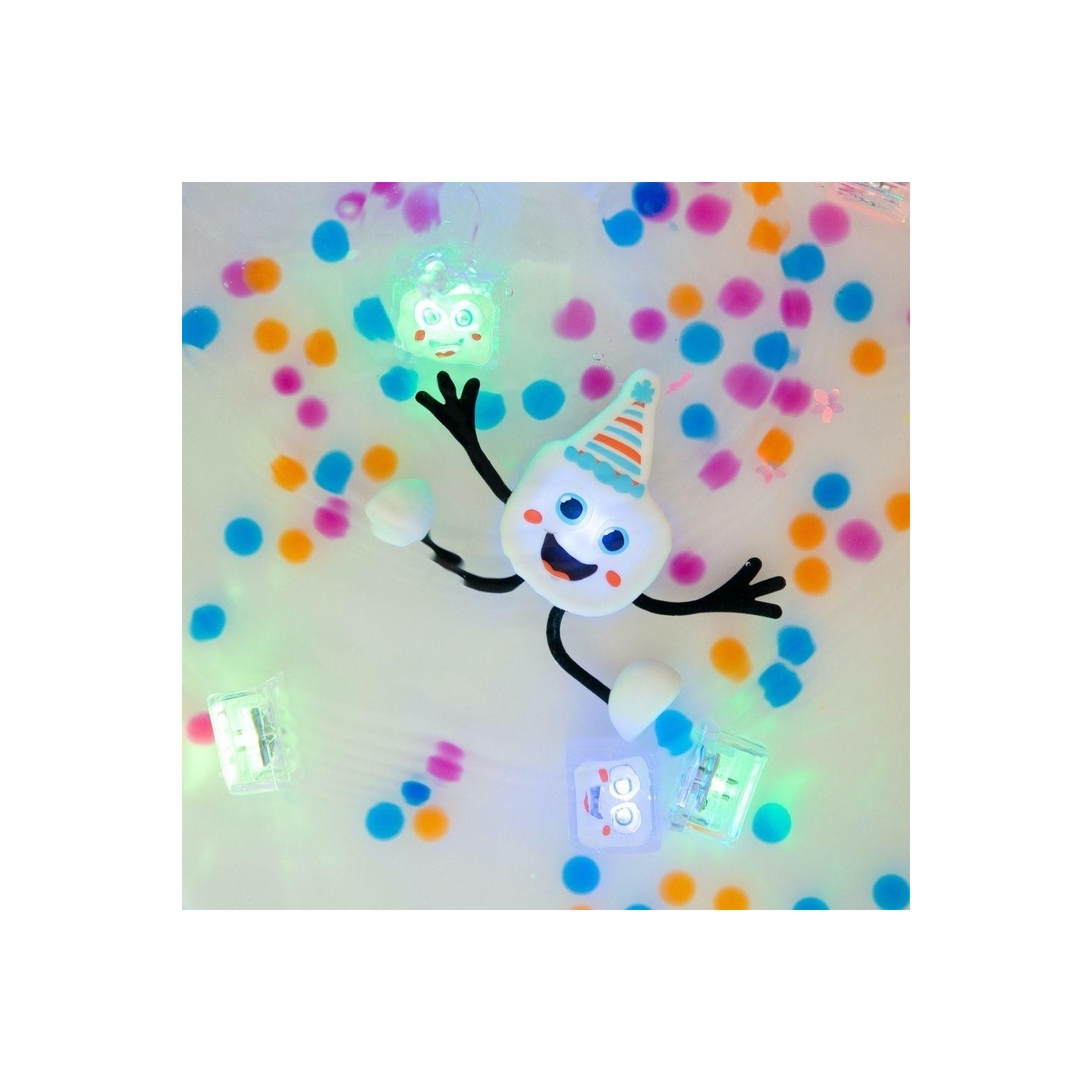 El Set de personaje Party + 2 cubos de luz multicolor Glopals brillaran dentro del agua siendo tan sencillo apagarlo como sacándolos del agua.