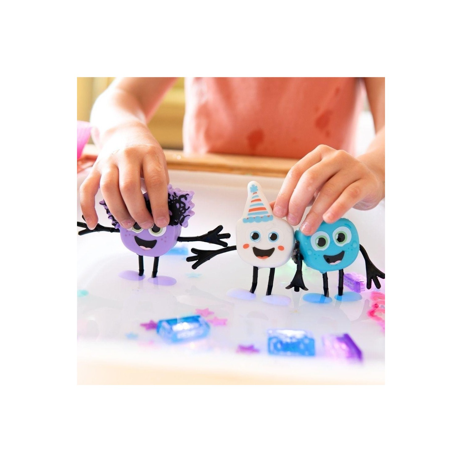 Introduce en el dorso del muñeco uno de los cubos y haz brillar a nuestro querido personaje. Perfecto compañero de juego, en una mesa sensorial para trabajar la relación causa/ efecto, fomentando la psicomotricidad fina y el reconocimiento de colores. Pero no pierdas la oportunidad de darte un baño relajante con tu personaje. Hasta a los peques más rebeldes al agua les fascinará.