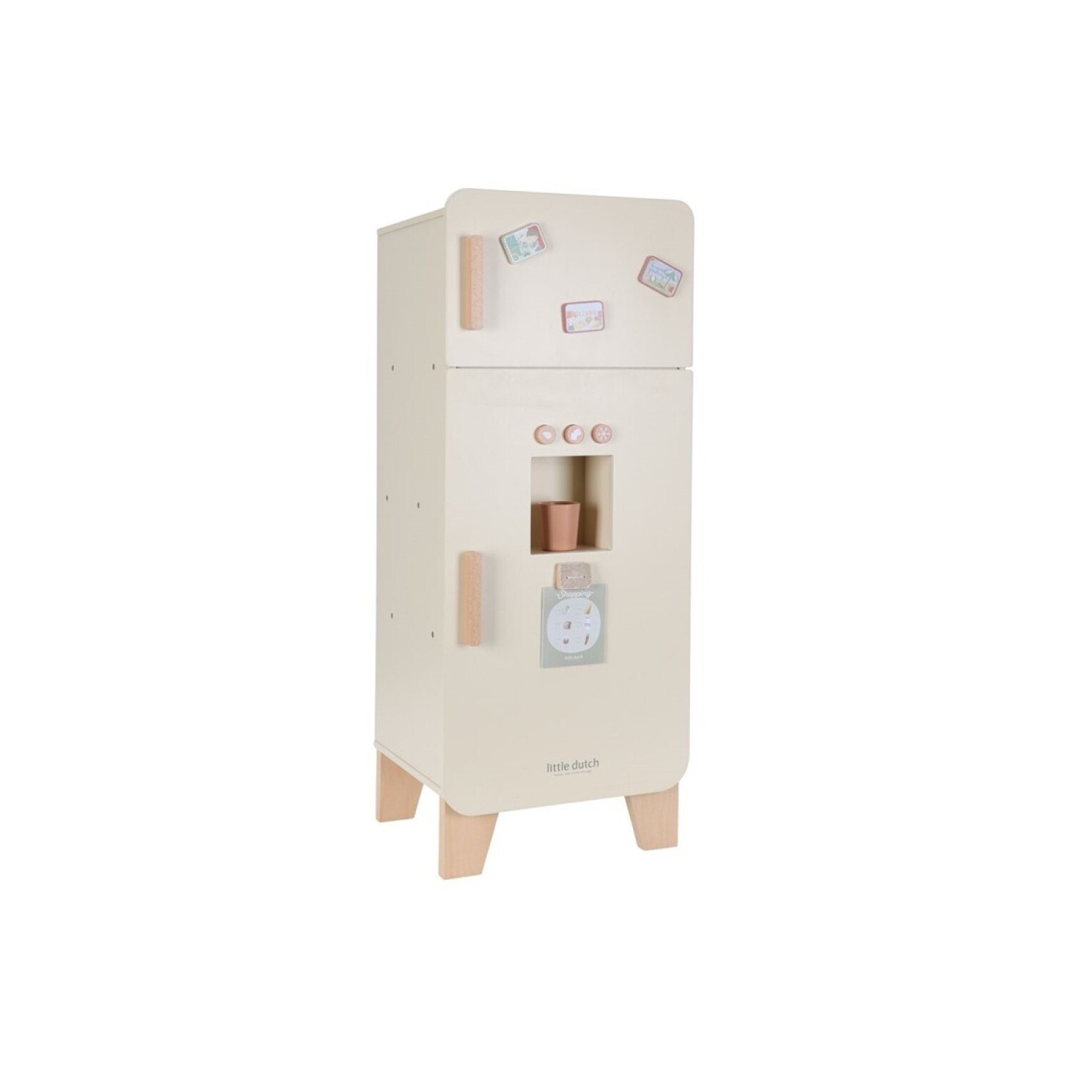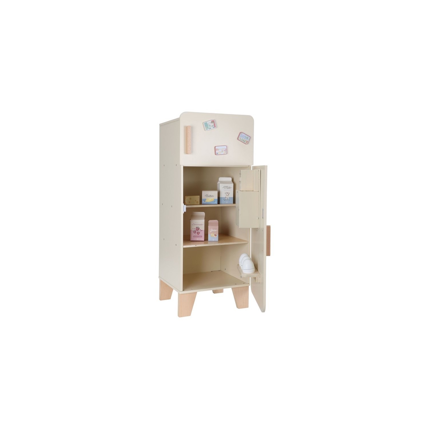 ¡Mantén tus alimentos frescos en esta bonita nevera de madera! La nevera cuenta con un práctico congelador con máquina para hacer cubitos de hielo y amplio espacio para guardar los alimentos de forma ordenada, incluyendo un porta huevos especial. Perfecto para que el juego de simulación en la cocina sea aún más realista. Con esta nevera, los niños se divertirán durante horas mientras aprenden sobre alimentos y su almacenamiento. ¡Un complemento maravilloso para cualquier cocina de juguete!