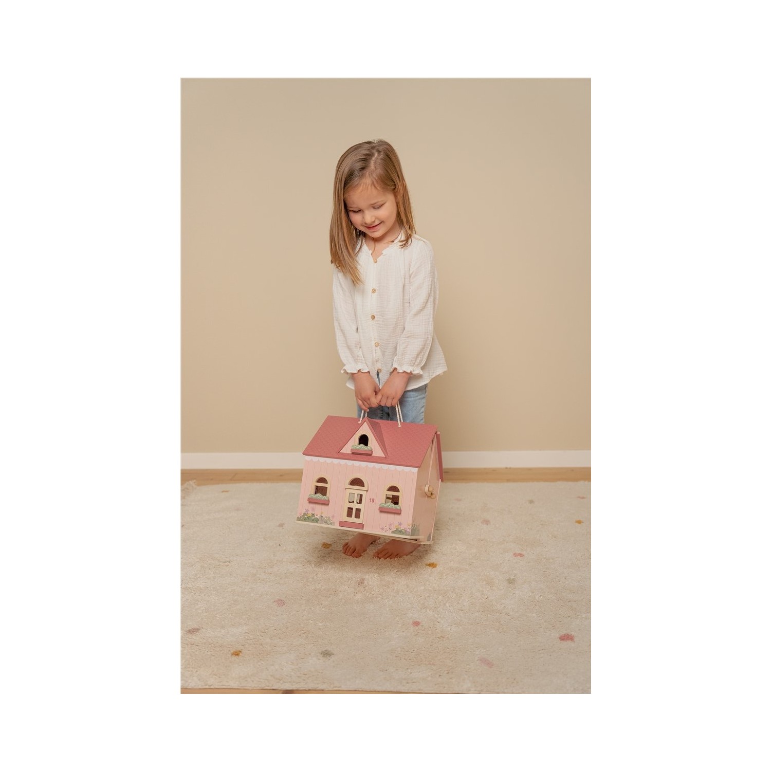 La casa de muñecas de madera portable de Little Dutch es una bonita y acogedora casa rosa con preciosos detalles. La casa tiene una sala de estar, una cocina en la primera planta, una habitación y un baño en la primera planta. Con el cierre de madera, la casa de muñecas se abre y cierra fácilmente y gracias al asa es fácil llevarla a cualquier parte. El mobiliario está incluido pero existe un set de expansión adicional para decorar la casa. La casa es perfecta para niños que adoren jugar