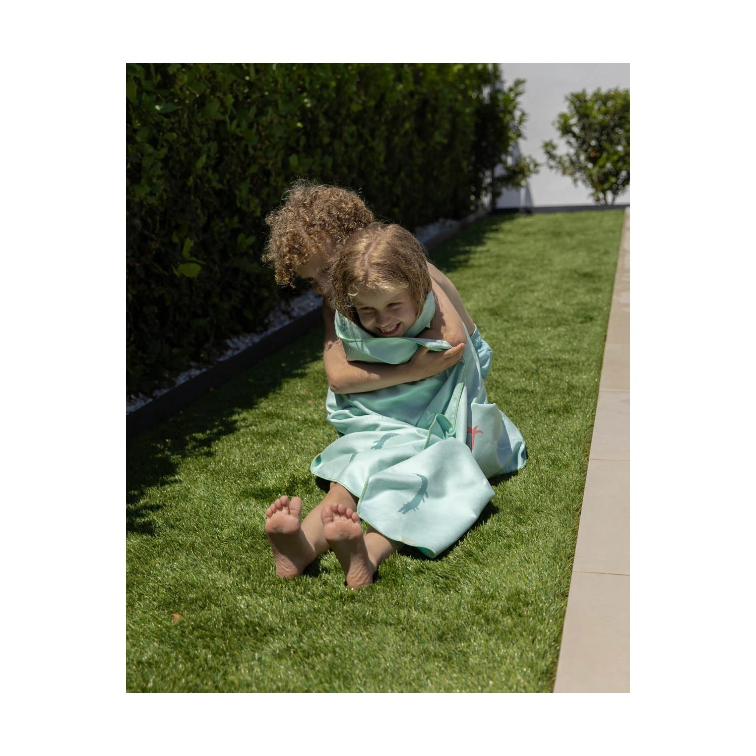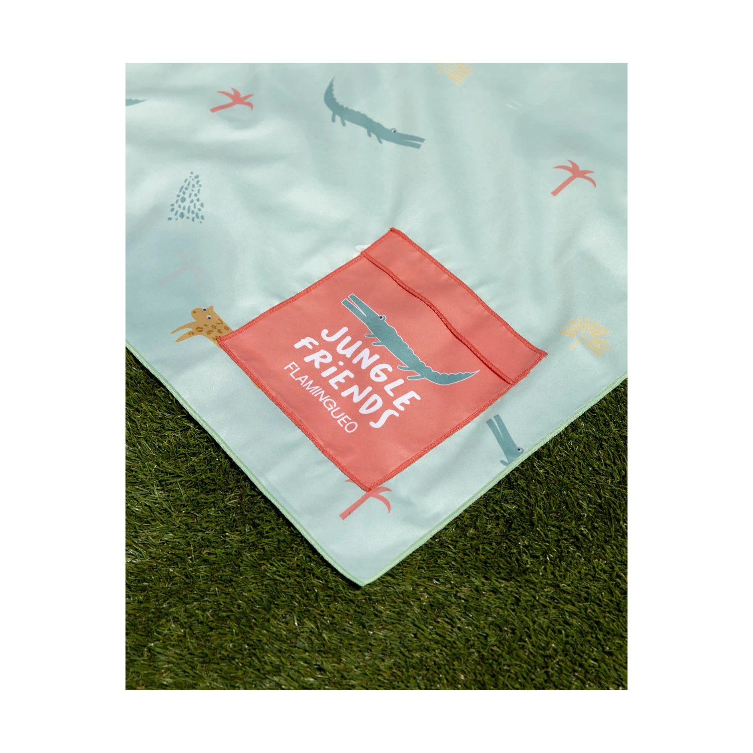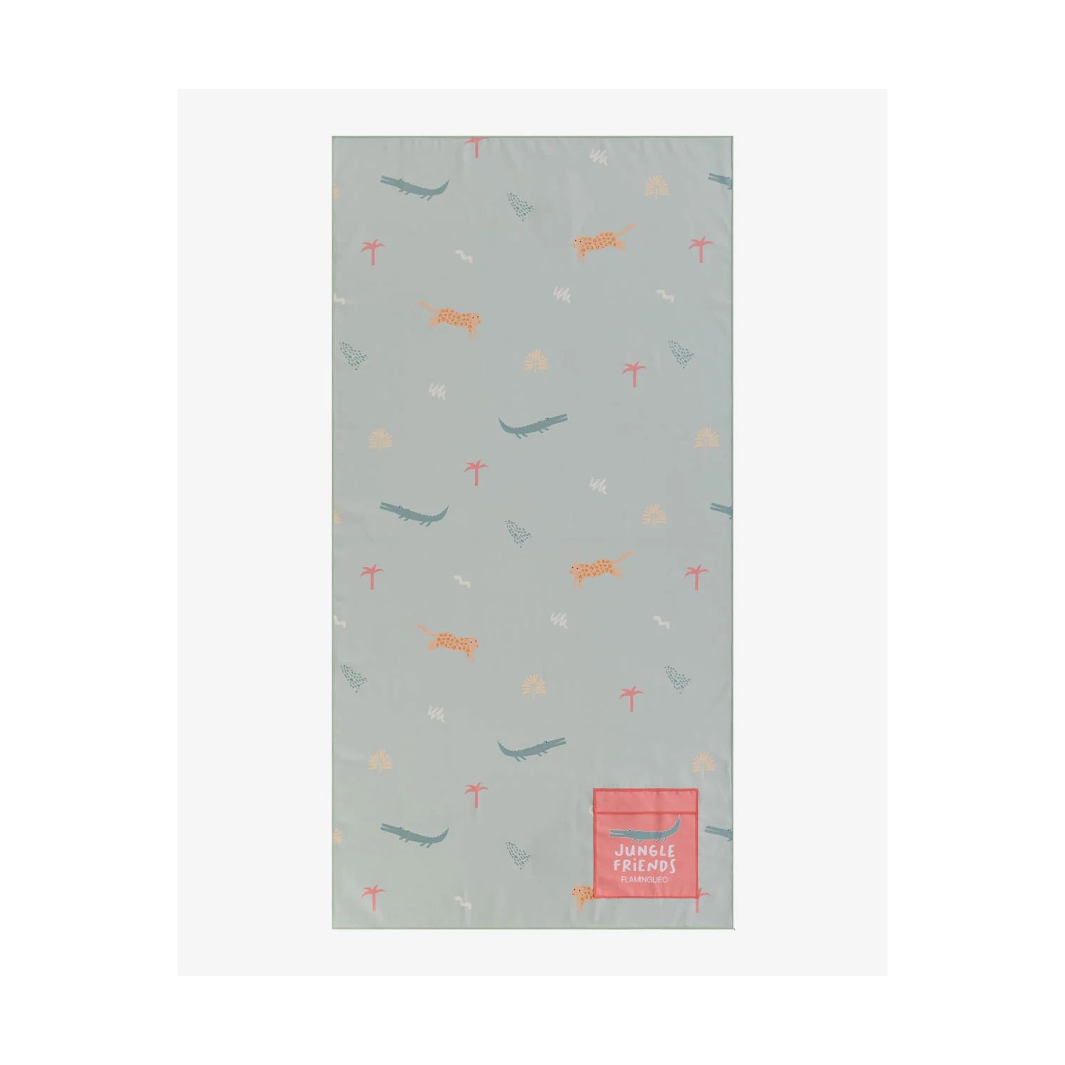 Toalla de microfibra verde colección niños perfecta para playa o piscina. Incluye bolsillo con cremallera, bolsa de transporte y es de secado rápida y ultraligera