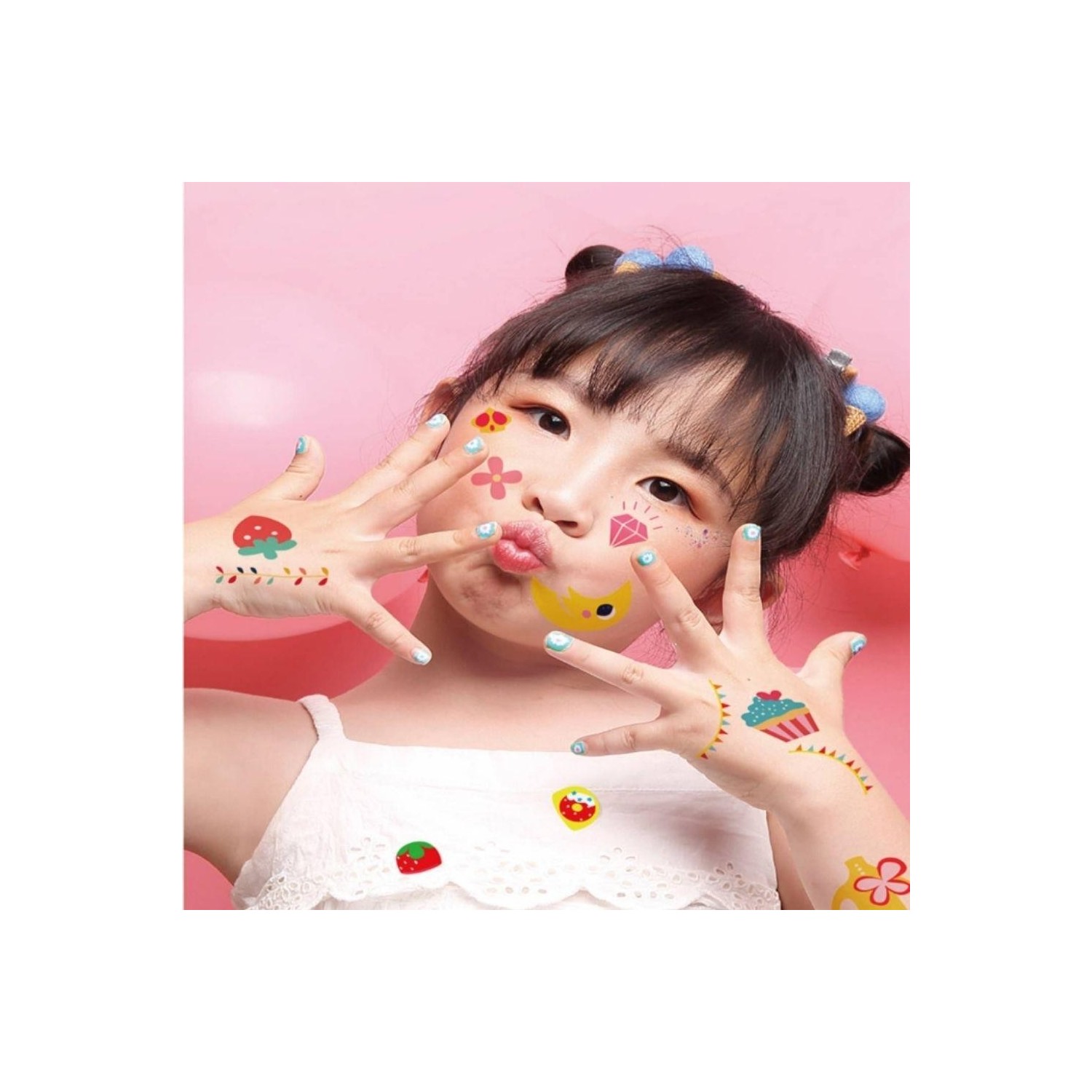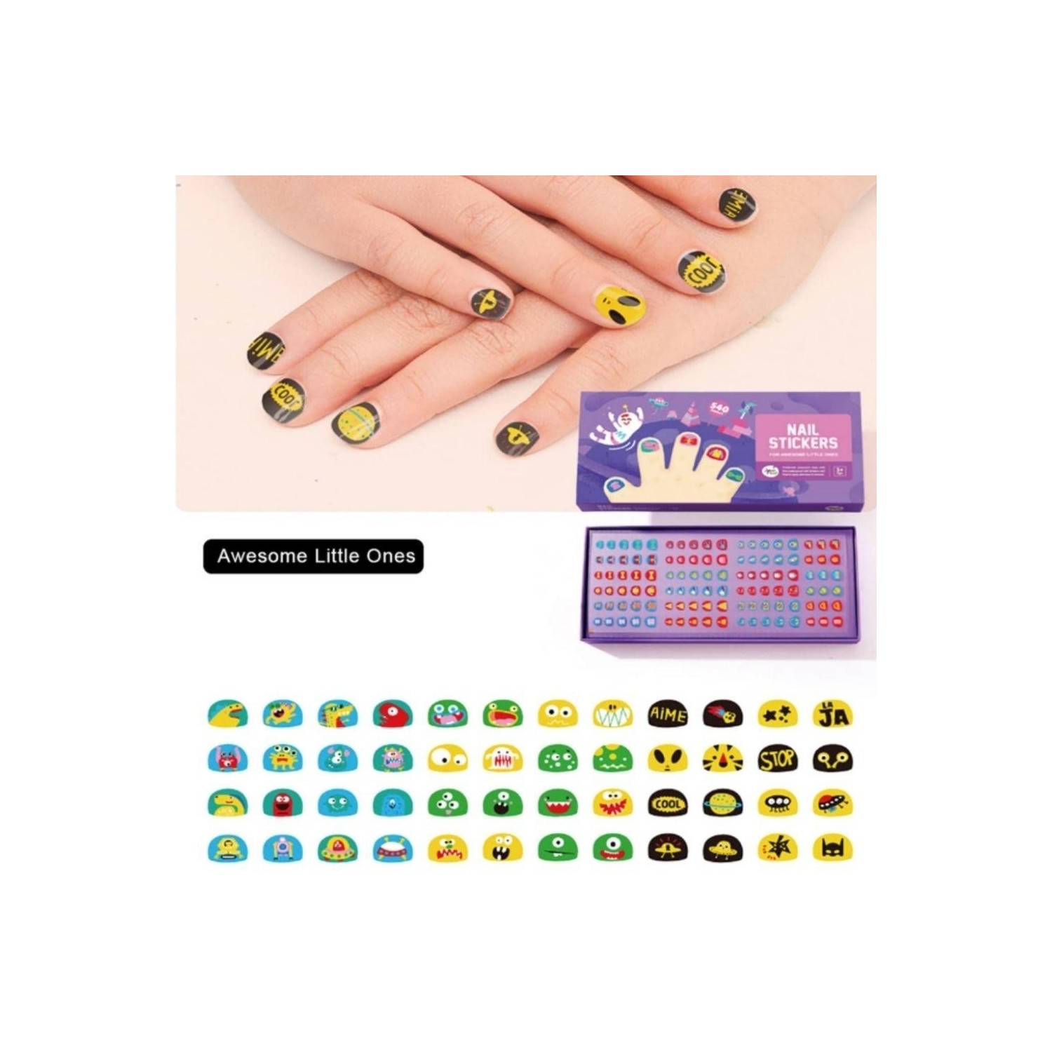 Incluye hasta 540 pegatinas con diseños infantiles llenos de color, adaptadas a distintos tamaños de uña para facilitar su colocación desde edades tempranas. Se aplican fácilmente y permiten cambiar de diseño siempre que apetezca.
