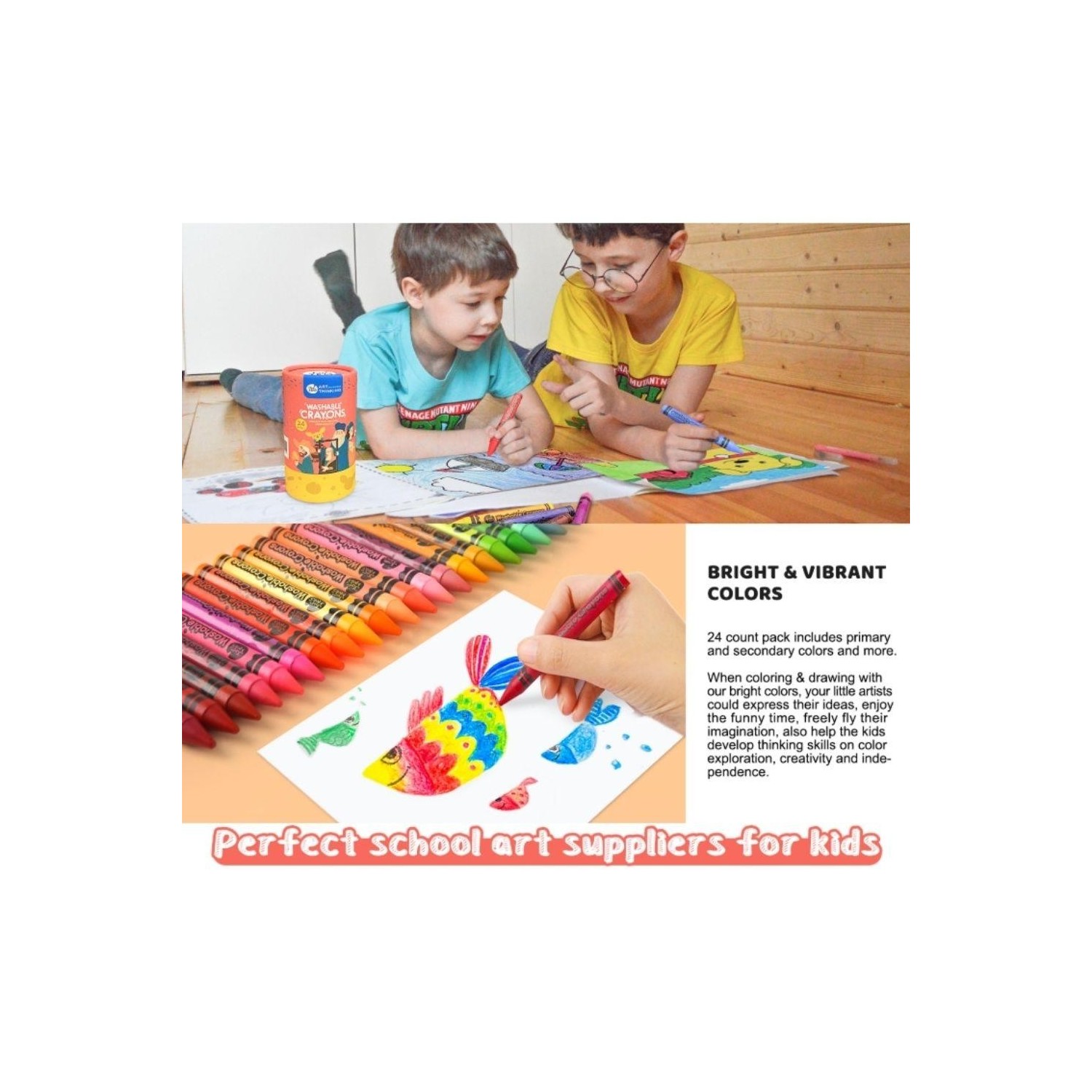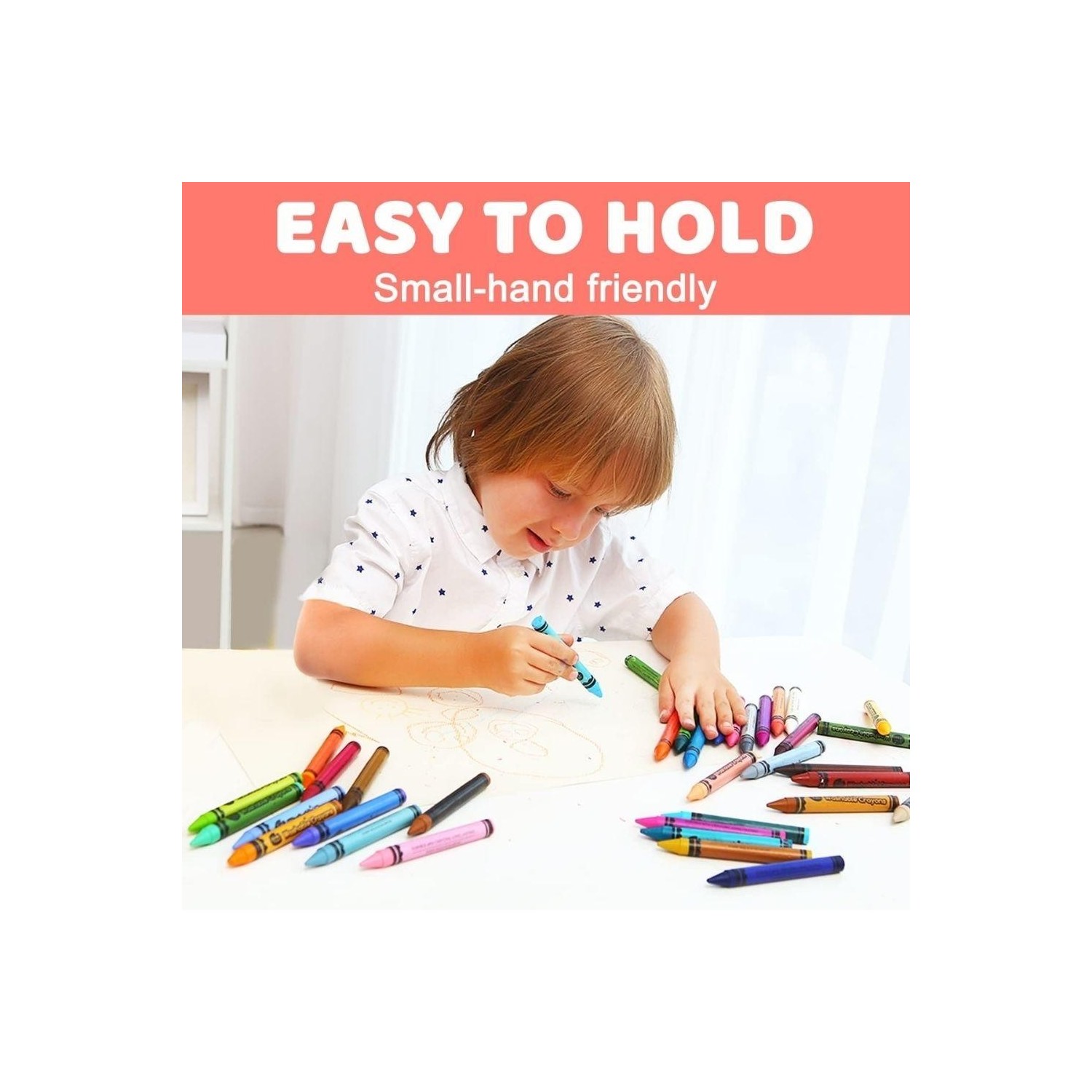 Cubo con 24 crayones lavables pensado para el uso diario en casa o en el aula. La forma ergonómica facilita el agarre de manos pequeñas y acompaña la pinza y el control de la presión, para que dibujen con comodidad y autonomía.