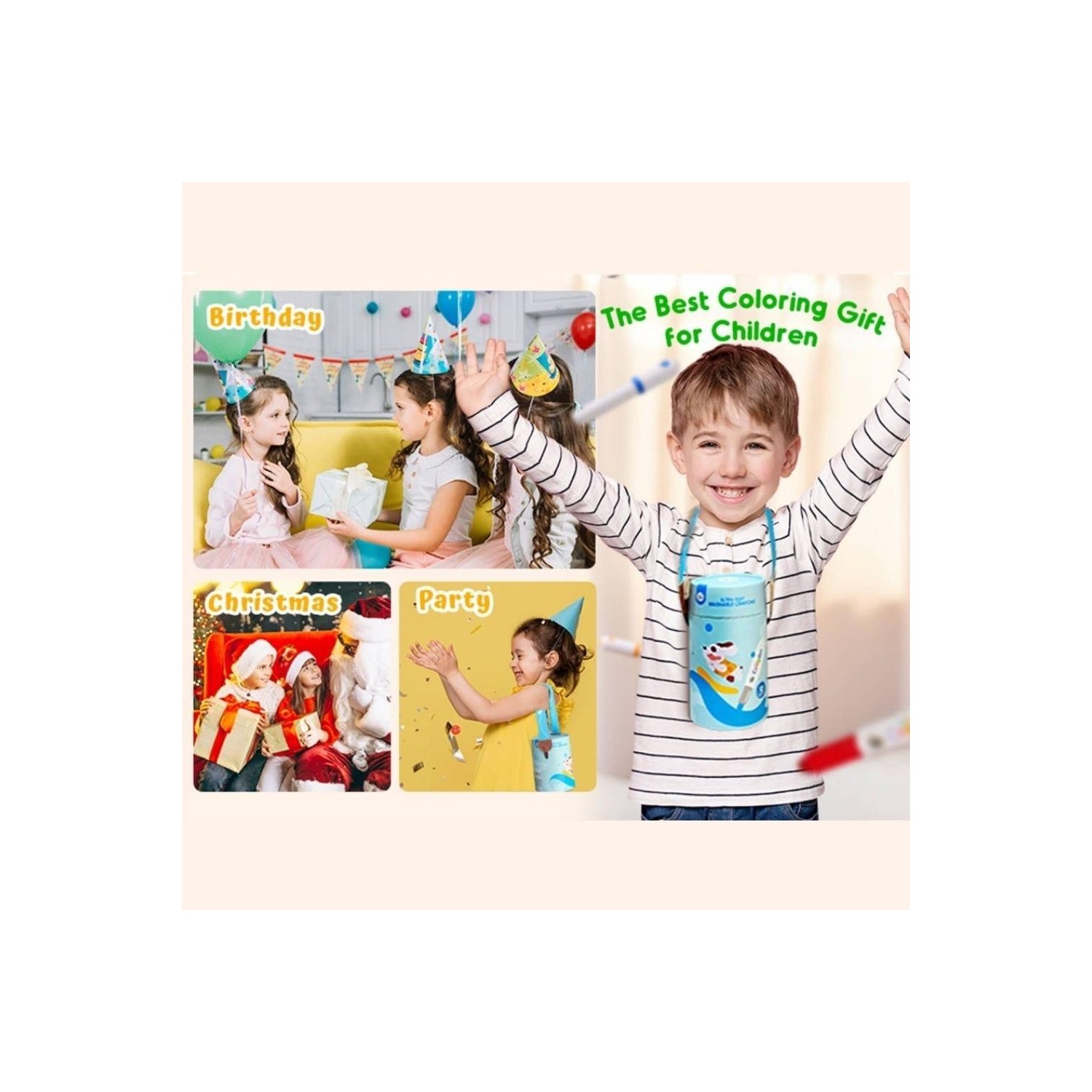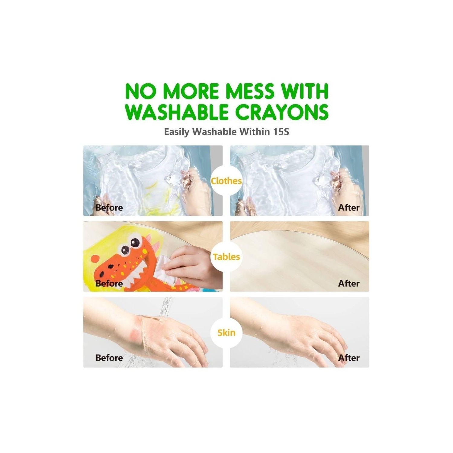 El cuerpo giratorio regula la salida de la mina, evitando roturas y permitiendo un uso limpio, cómodo y adecuado para manos pequeñas. La fórmula es lavable en la piel, ropa y superficies, ideal para un juego creativo sin preocupaciones.