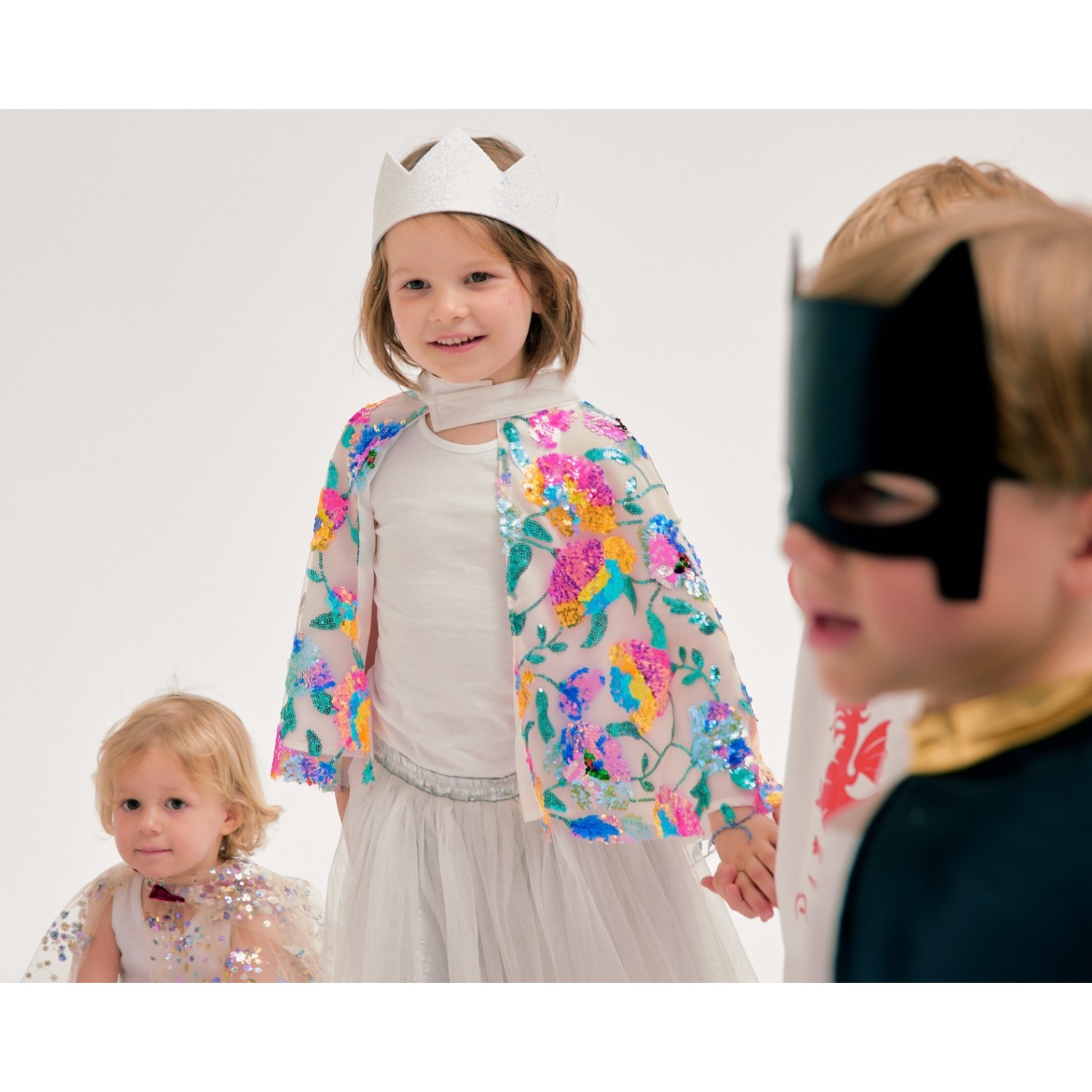 La capa está bordada con lentejuelas multicolores y forrada con popelina de algodón.