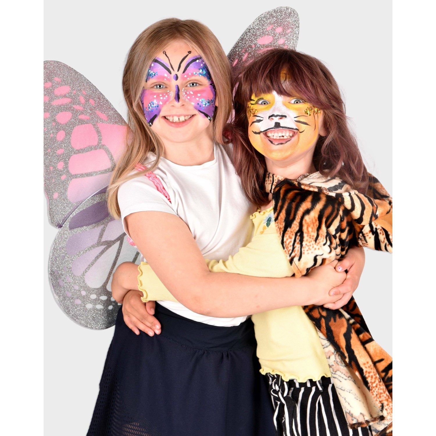 Las pinturas faciales/purpurina se lavan con agua y jabón. El color de los crayones para el cabello se elimina con champú y agua.
