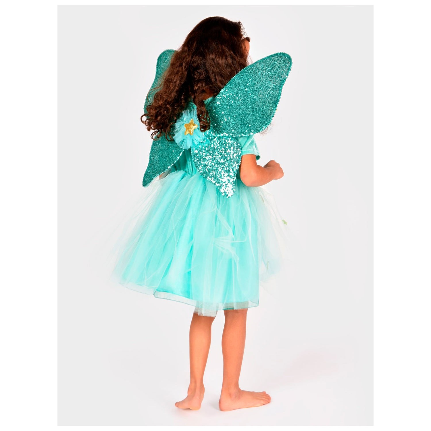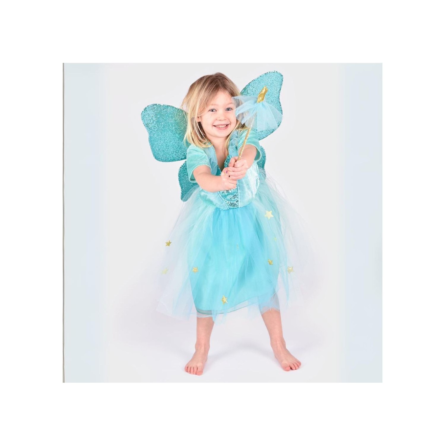 Disfraz en color turquesa que incluye el vestido, las alas y la varita.