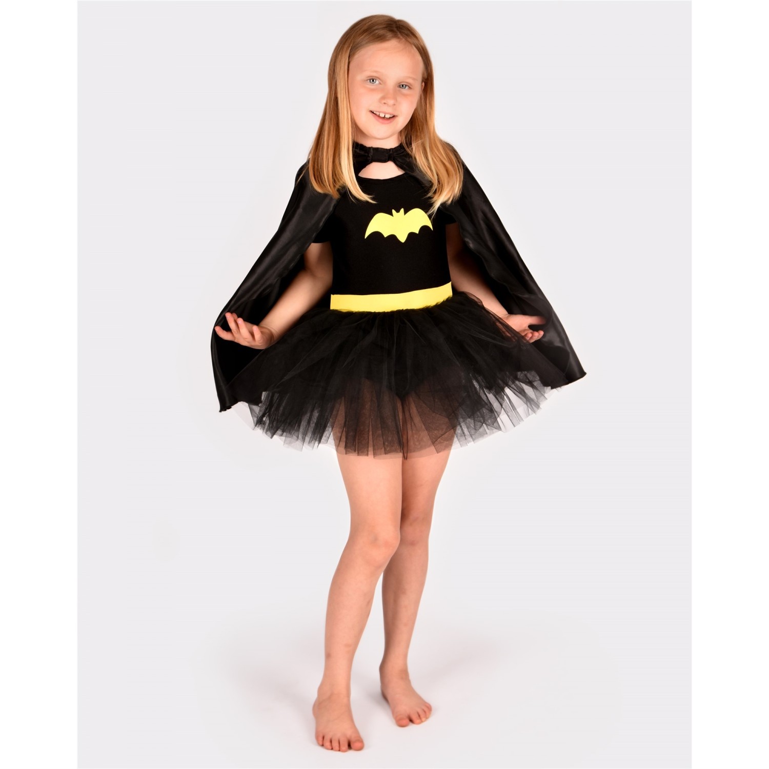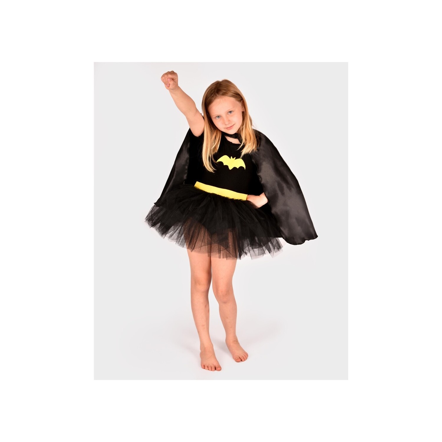 El traje tiene una preciosa falda mullida, una cinta amarilla en la cintura y un estampado de murciélago tanto en la parte delantera de la camiseta como en la capa.