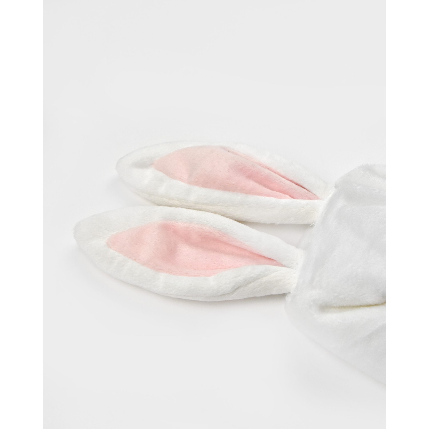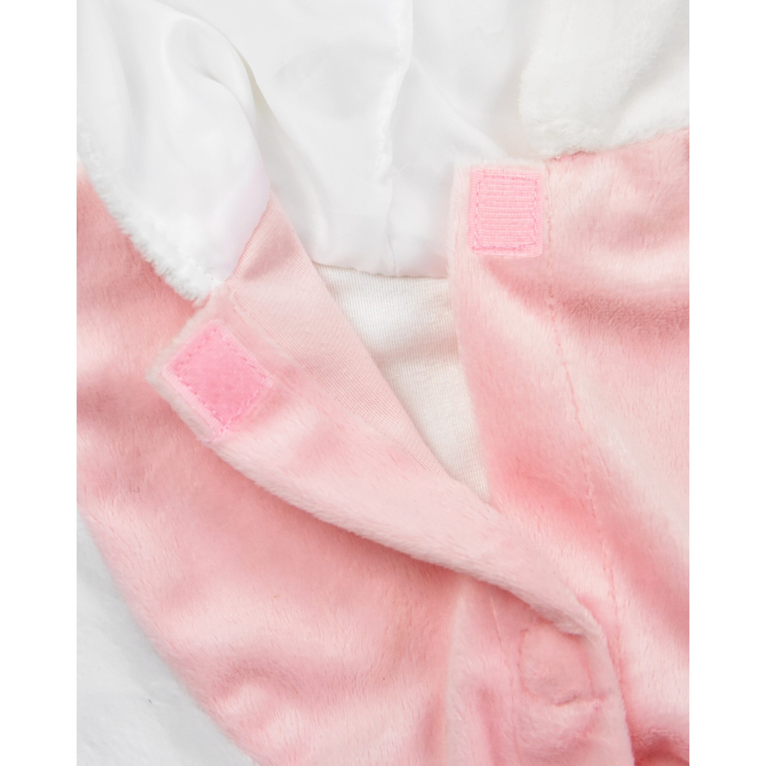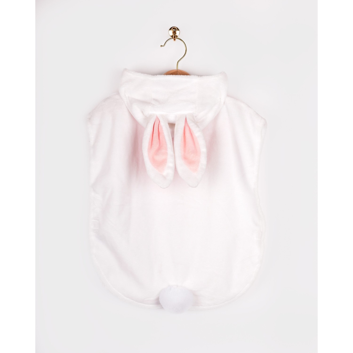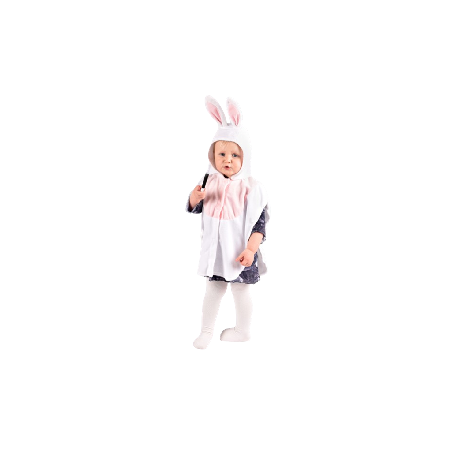 El disfraz se cierra con velcro por la parte delantera, incluye capucha cosida con orejas y una cola de conejo cosida en el final del disfraz. En ambos laterales tiene una banda elástica. Está fabricado con 100% poliéster.