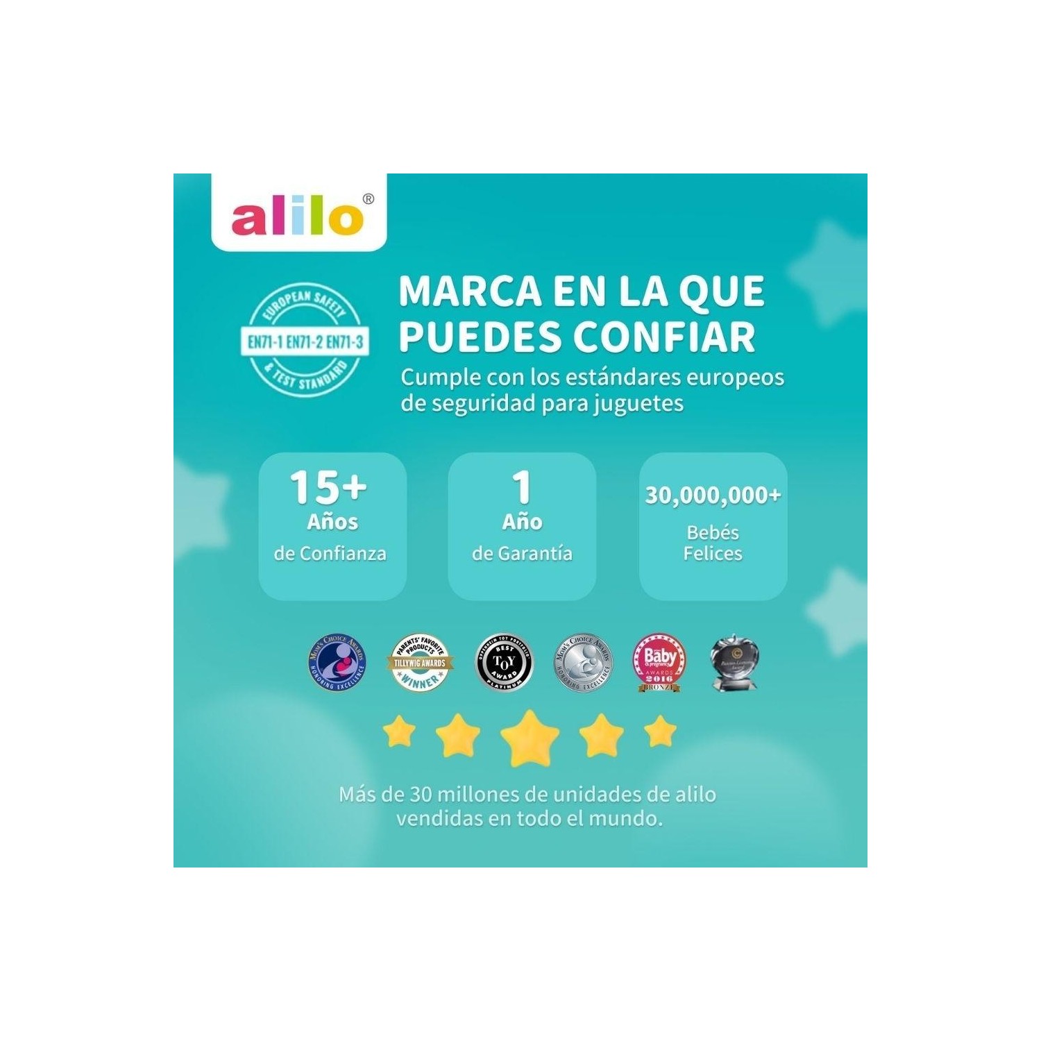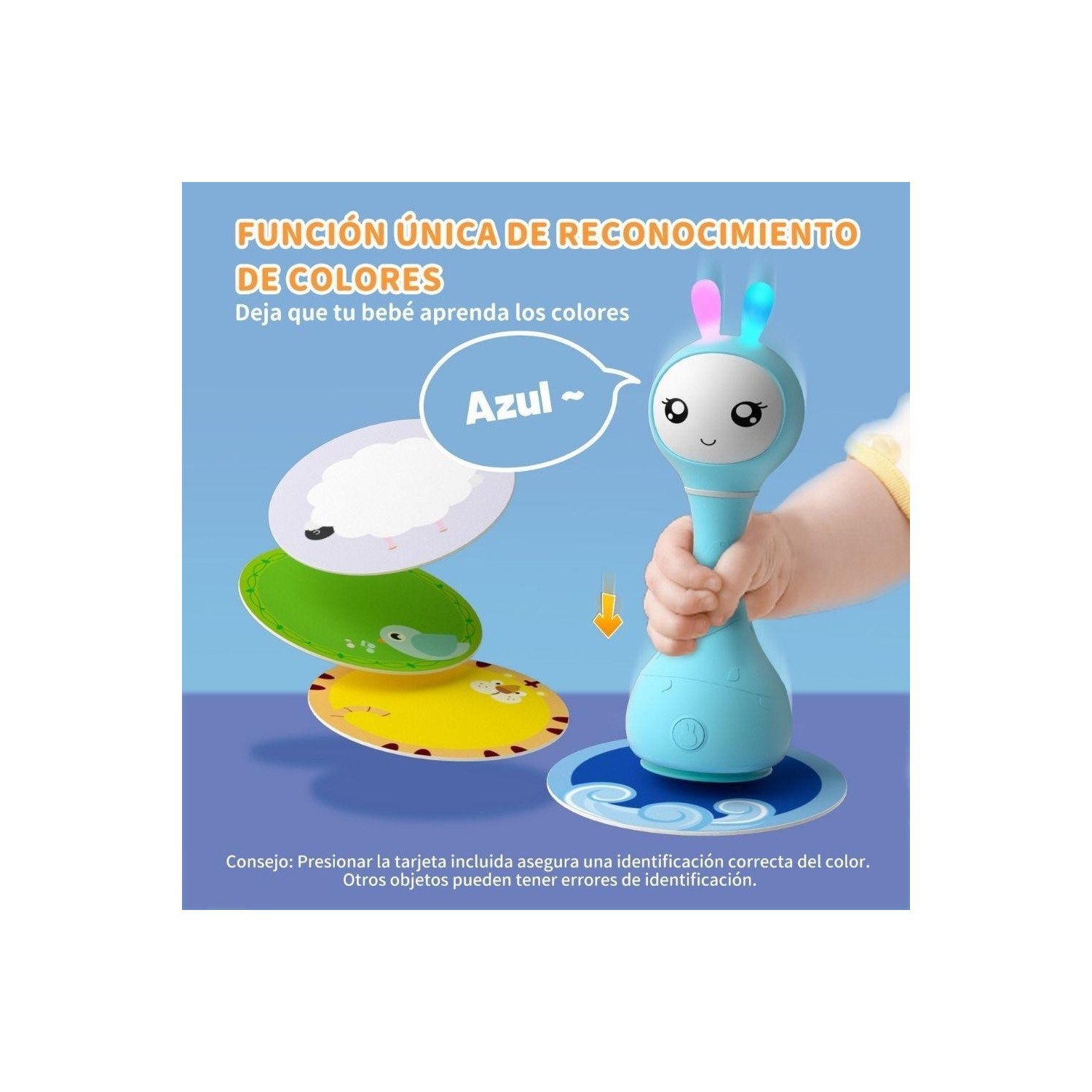 - Reconocimiento interactivo de colores: gracias a las tarjetas didácticas incluidas, el juguete identifica colores en español e inglés, y sus orejas de silicona se iluminan con el color correspondiente, reforzando el aprendizaje visual y auditivo.