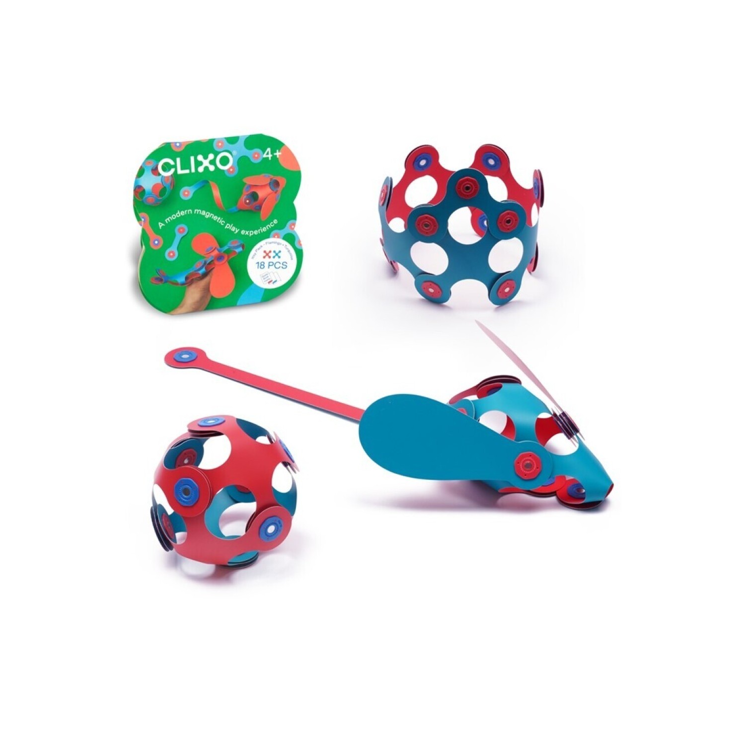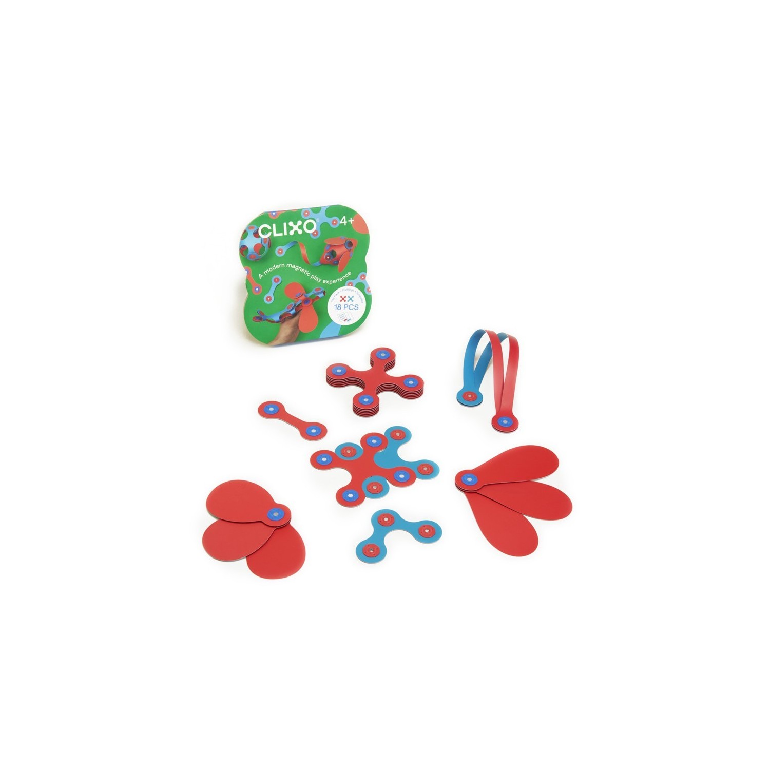 18 piezas en 6 formas únicas de CLIXO y una guía de inicio rápido, ¡Este pack de iniciación tiene el tamaño perfecto para llevarlo de viaje a cualquier sitio, y estará listo inmediatamente para jugar y empezar a construir allá donde estéis!
