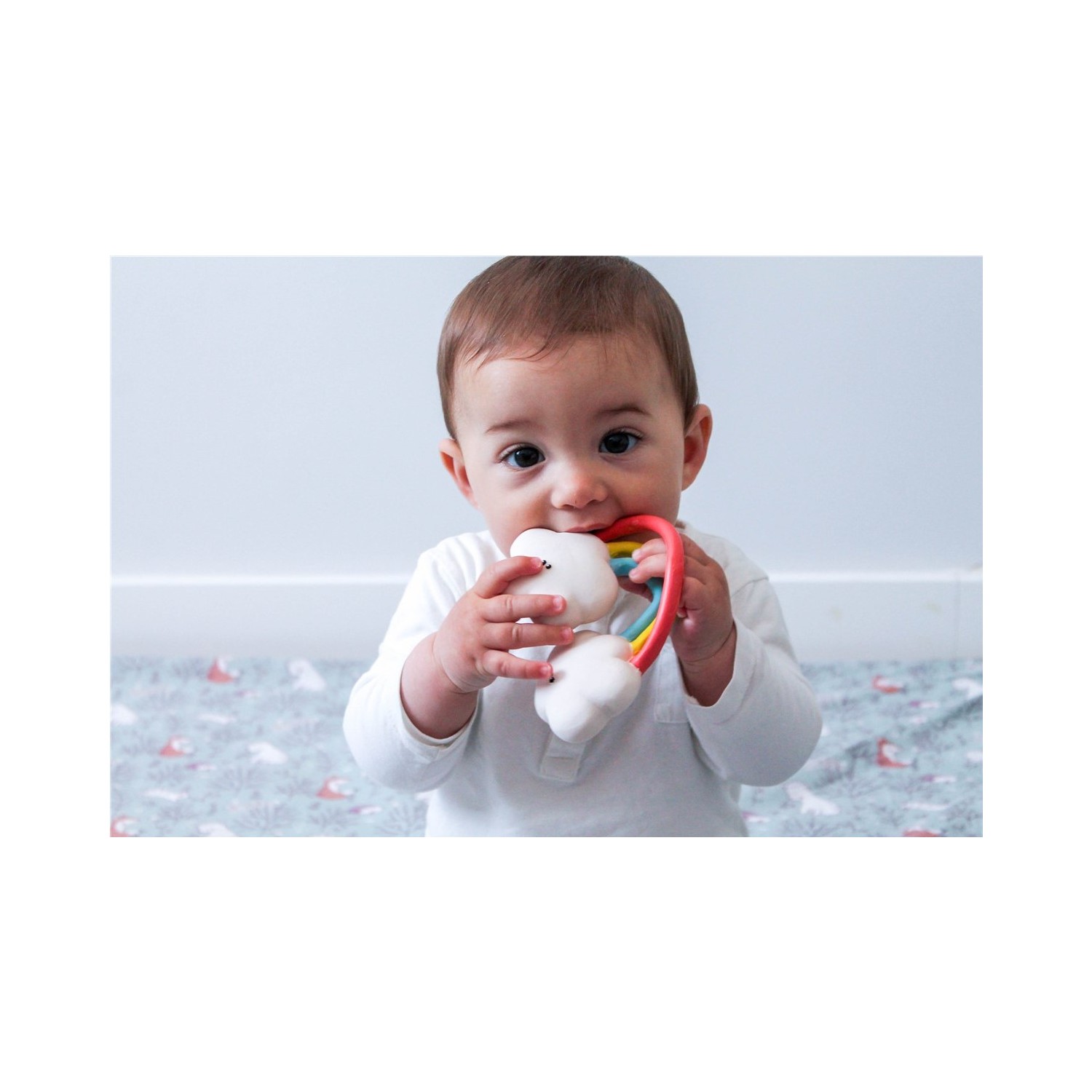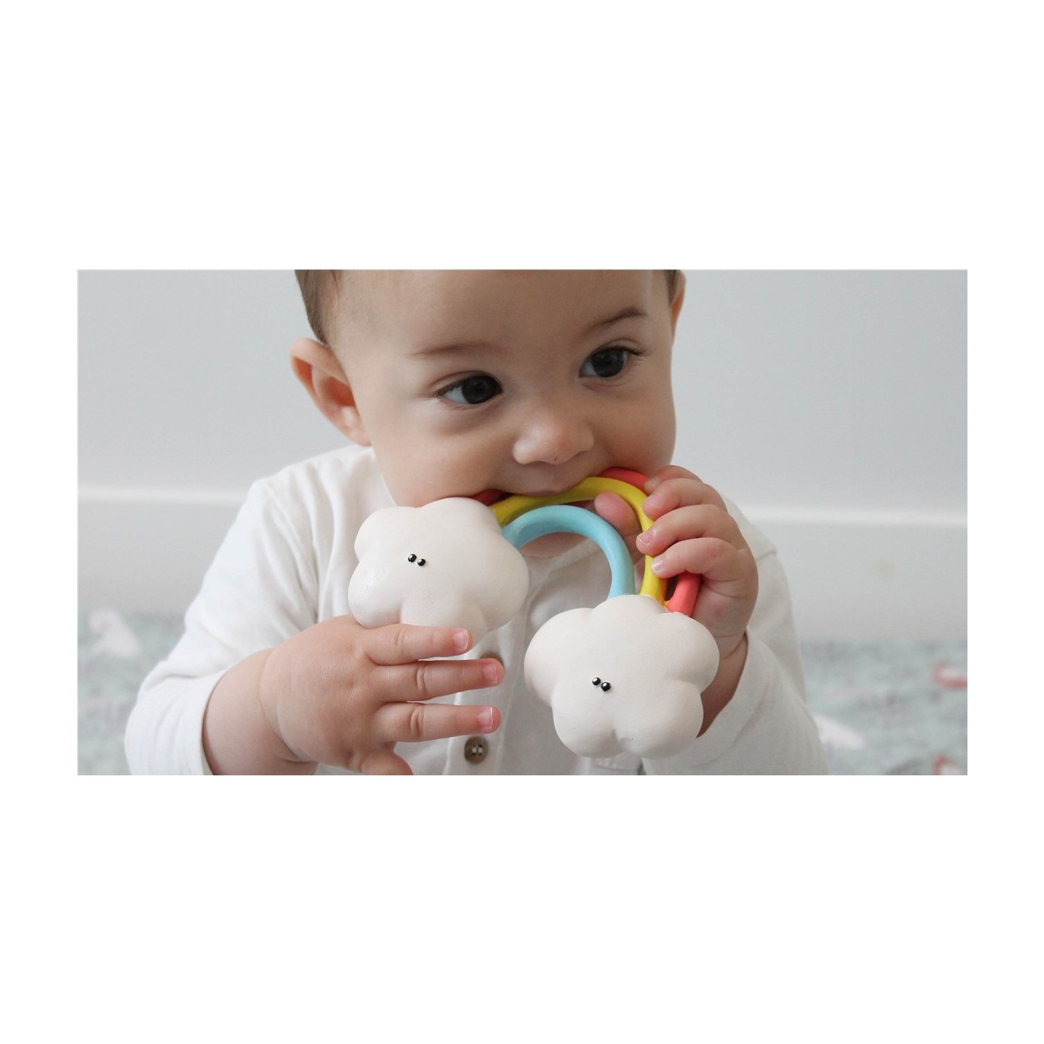 Precioso mordedor arco iris. Es un juguete suave, flexible, ligero y de fácil agarre. La forma separada de sus arcos favorece la prensión, el bebé puede entrelazar sus dedos entre ellos favoreciendo así el desarrollo de la motricidad fina. De tacto muy suave, ideal para morder y calmar las encías del bebé. Sus colores en contraste facilitan la atención y fijación visual, imprescindibles en el desarrollo visual de los bebés.