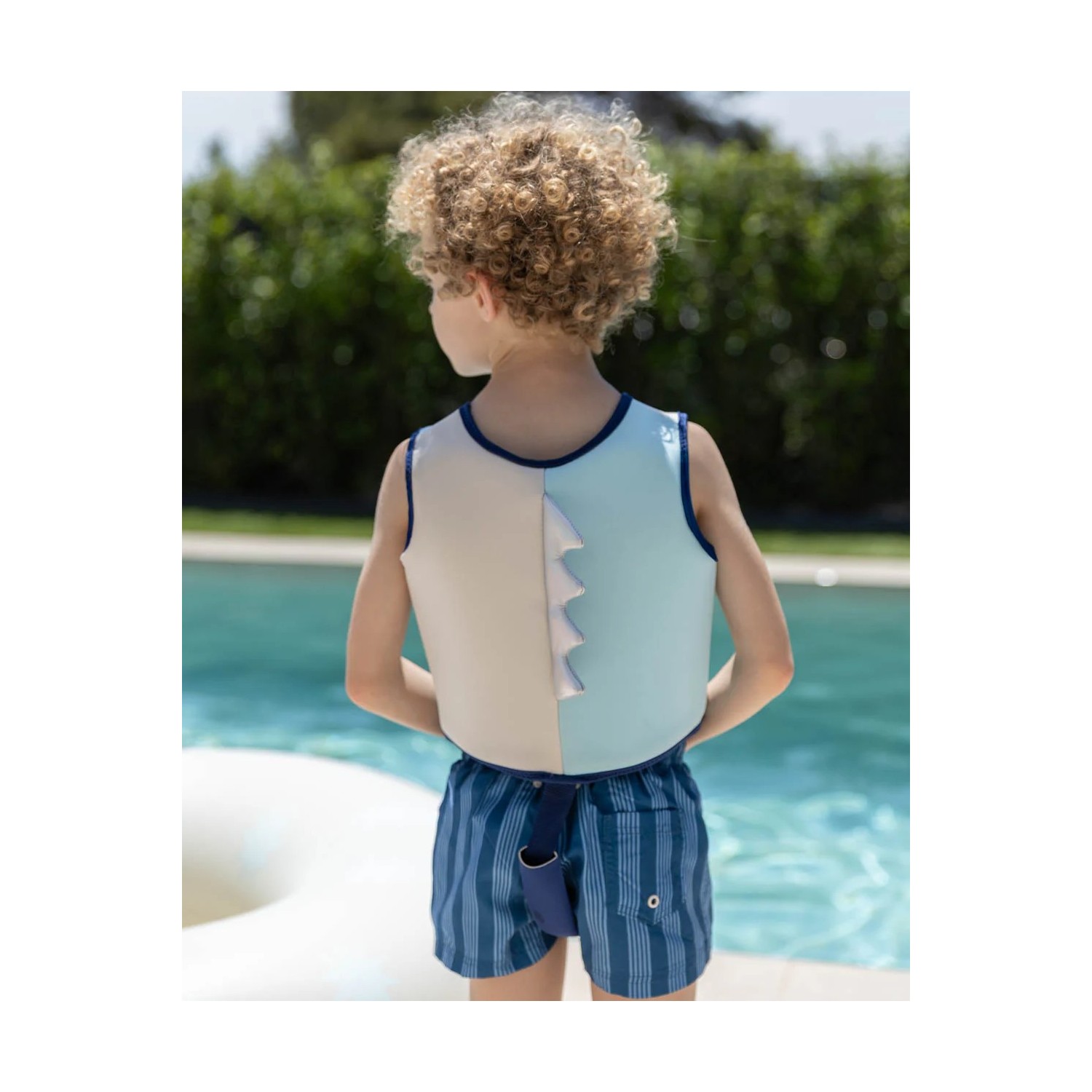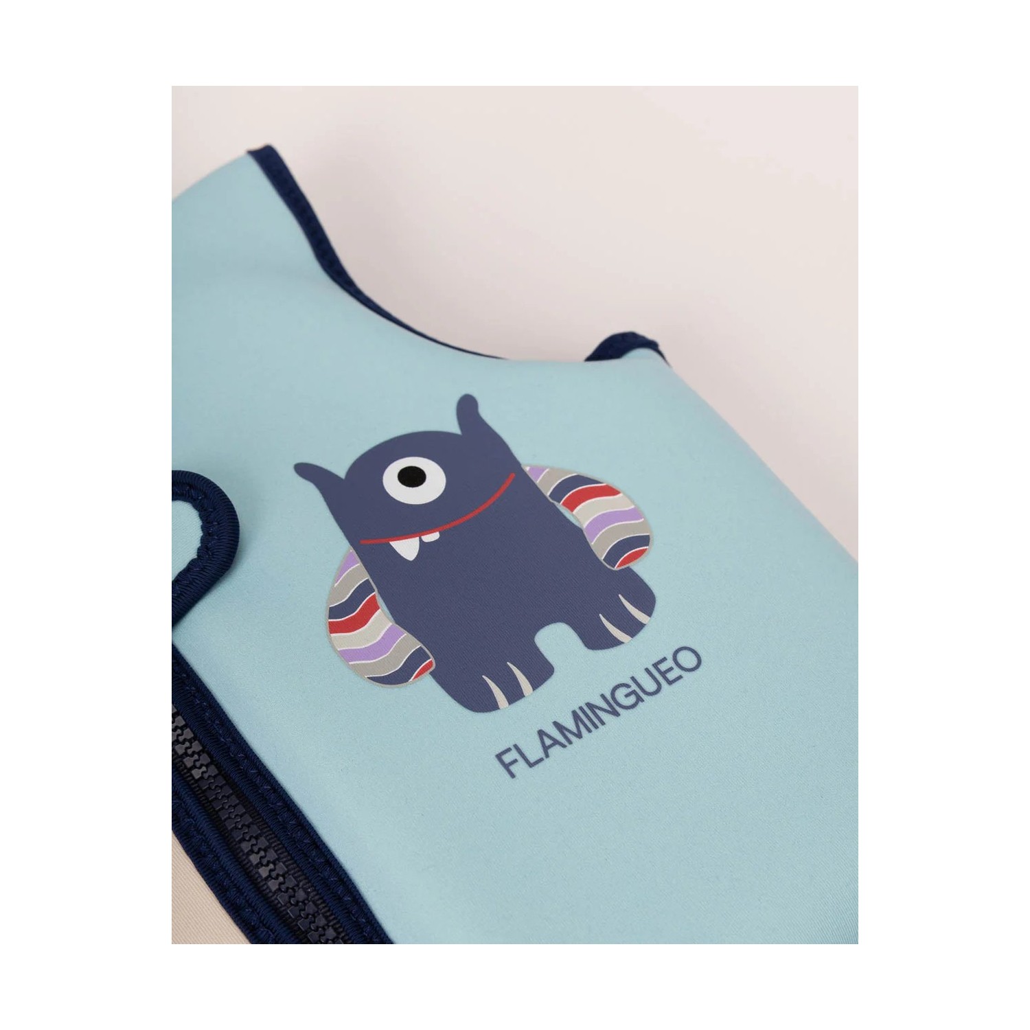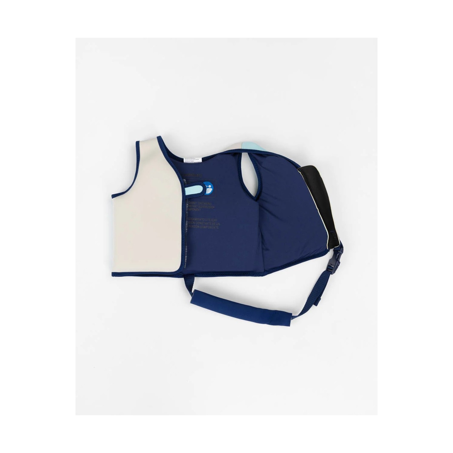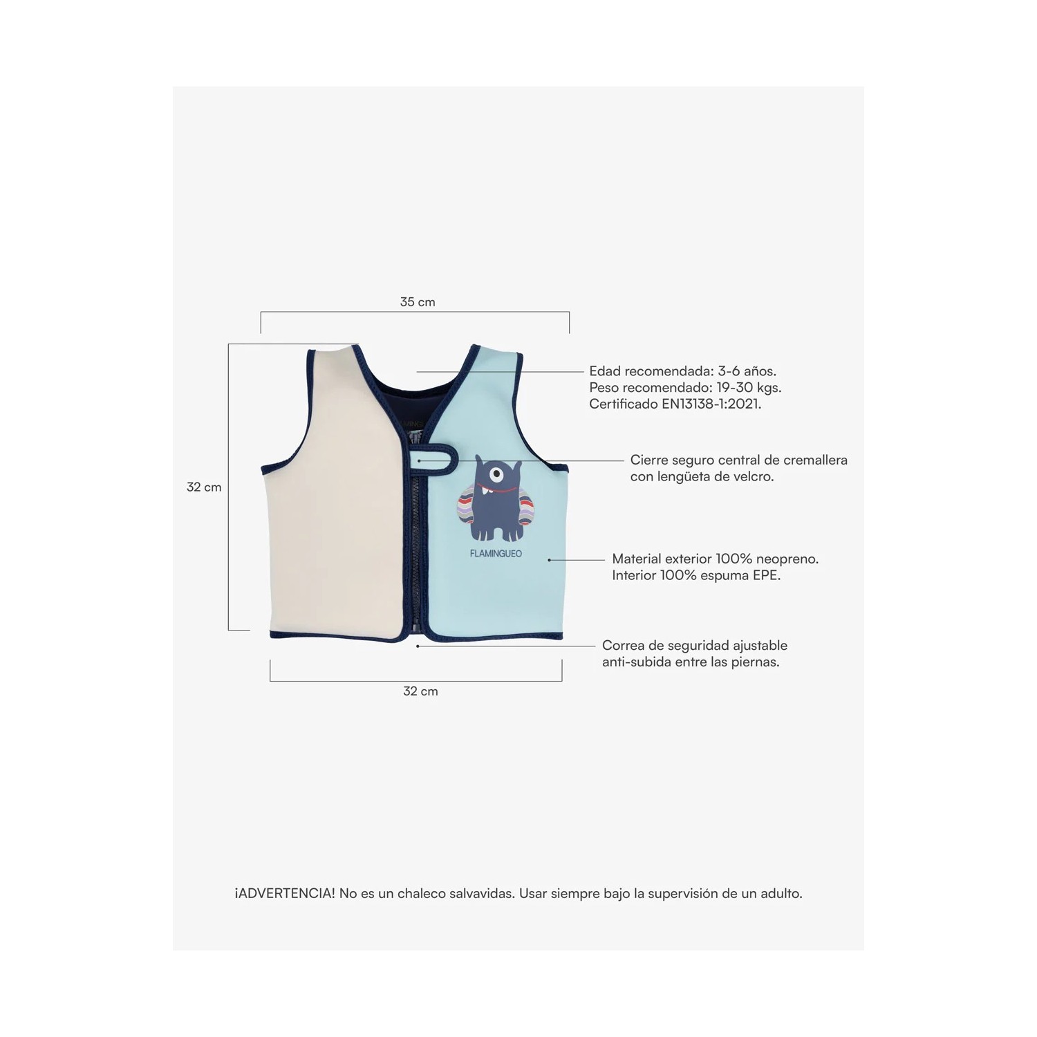 Chaleco de flotación homologado con print de animales de la jungla. Detalle divertido en la espalda. Dispone de una cinta con cierre de seguridad para colocar entre las piernas con el fin de que el chaleco no se salga por la cabeza. Esta cinta está protegida con neopreno para evitar rozaduras entre las piernas.