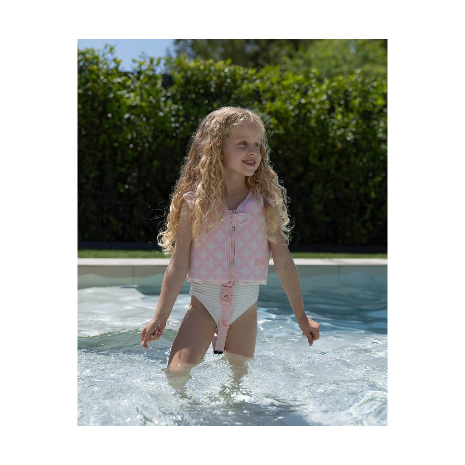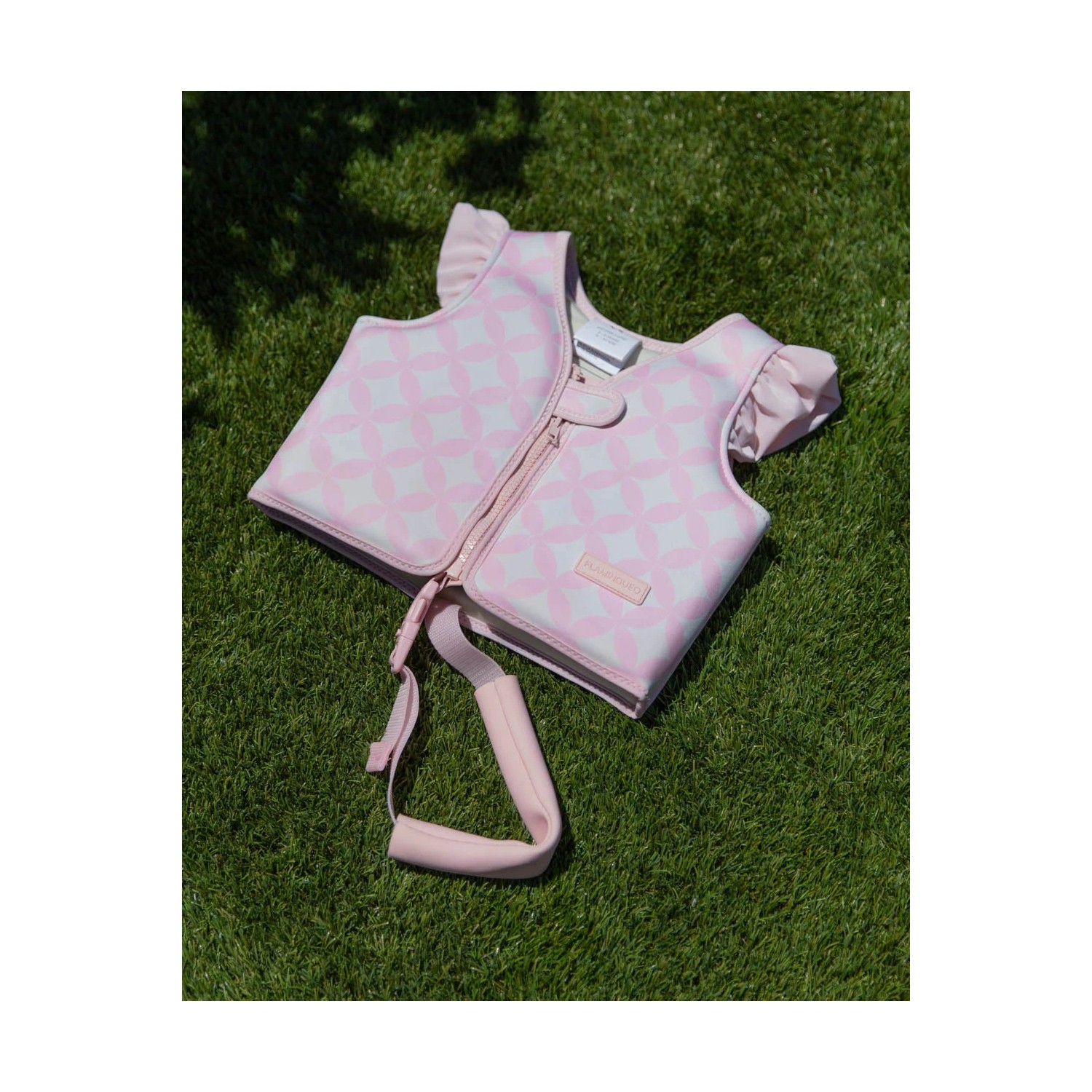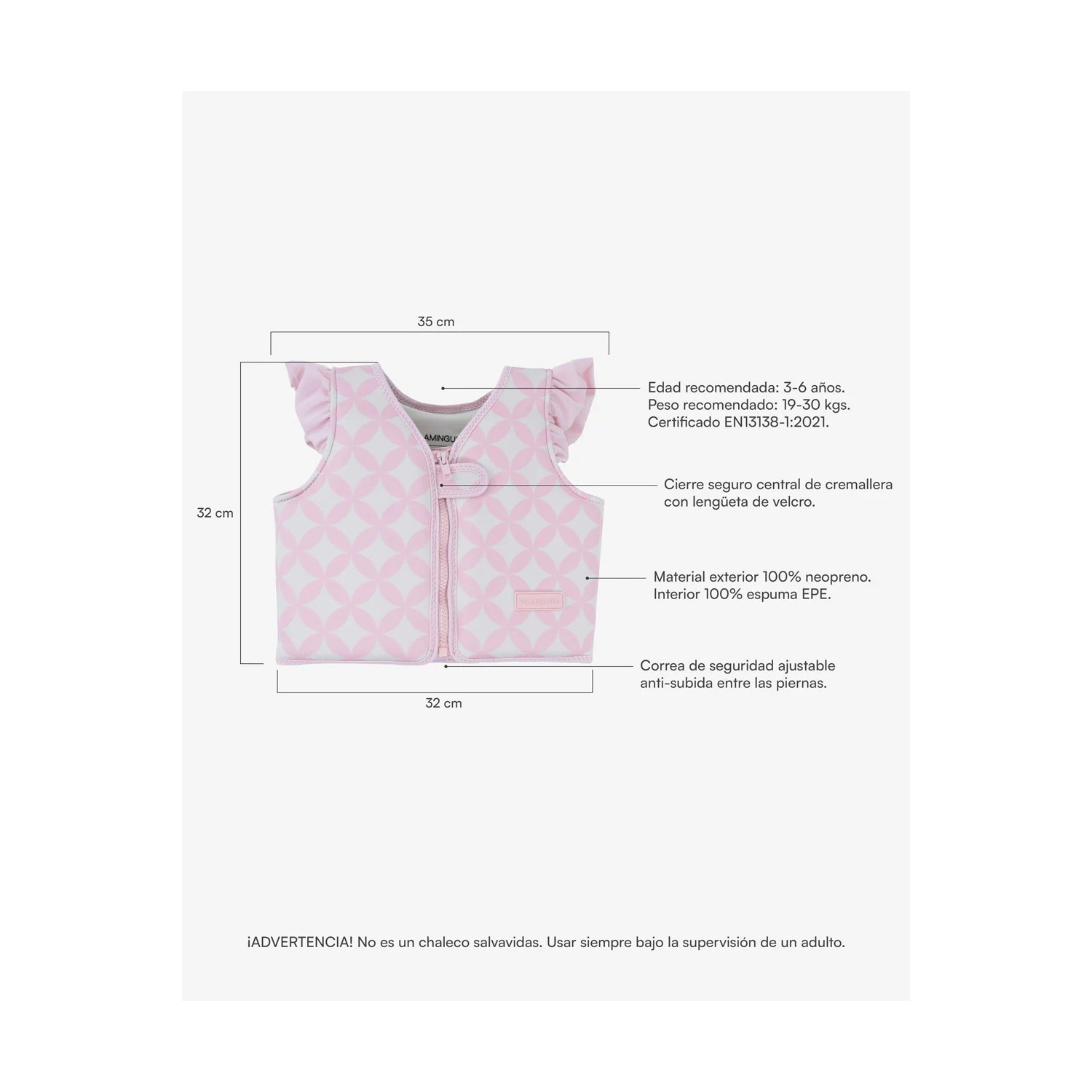 Chaleco de flotación homologado con print de animales de la jungla. Detalle divertido en los hombros. Dispone de una cinta con cierre de seguridad para colocar entre las piernas con el fin de que el chaleco no se salga por la cabeza. Esta cinta está protegida con neopreno para evitar rozaduras entre las piernas.