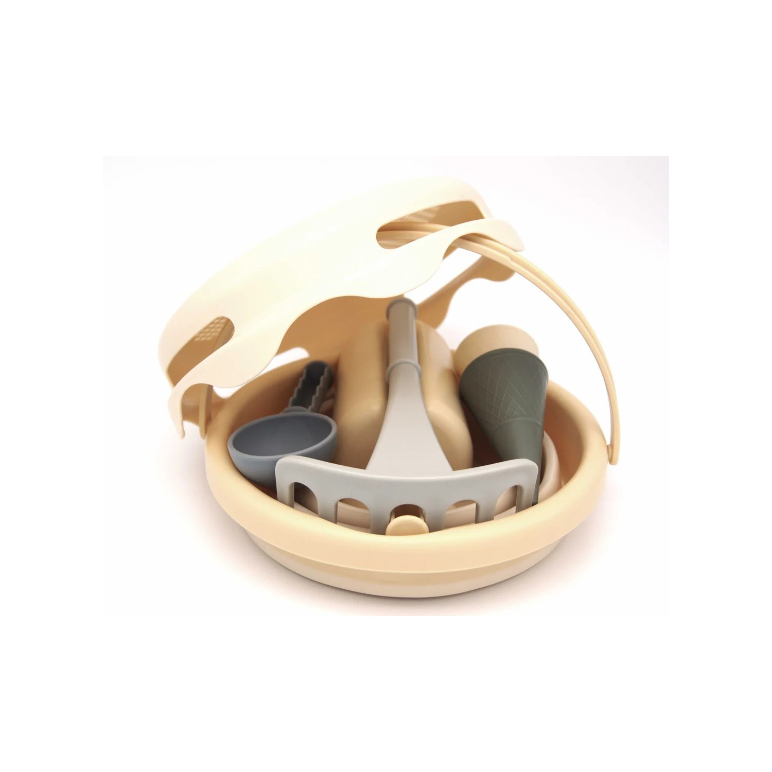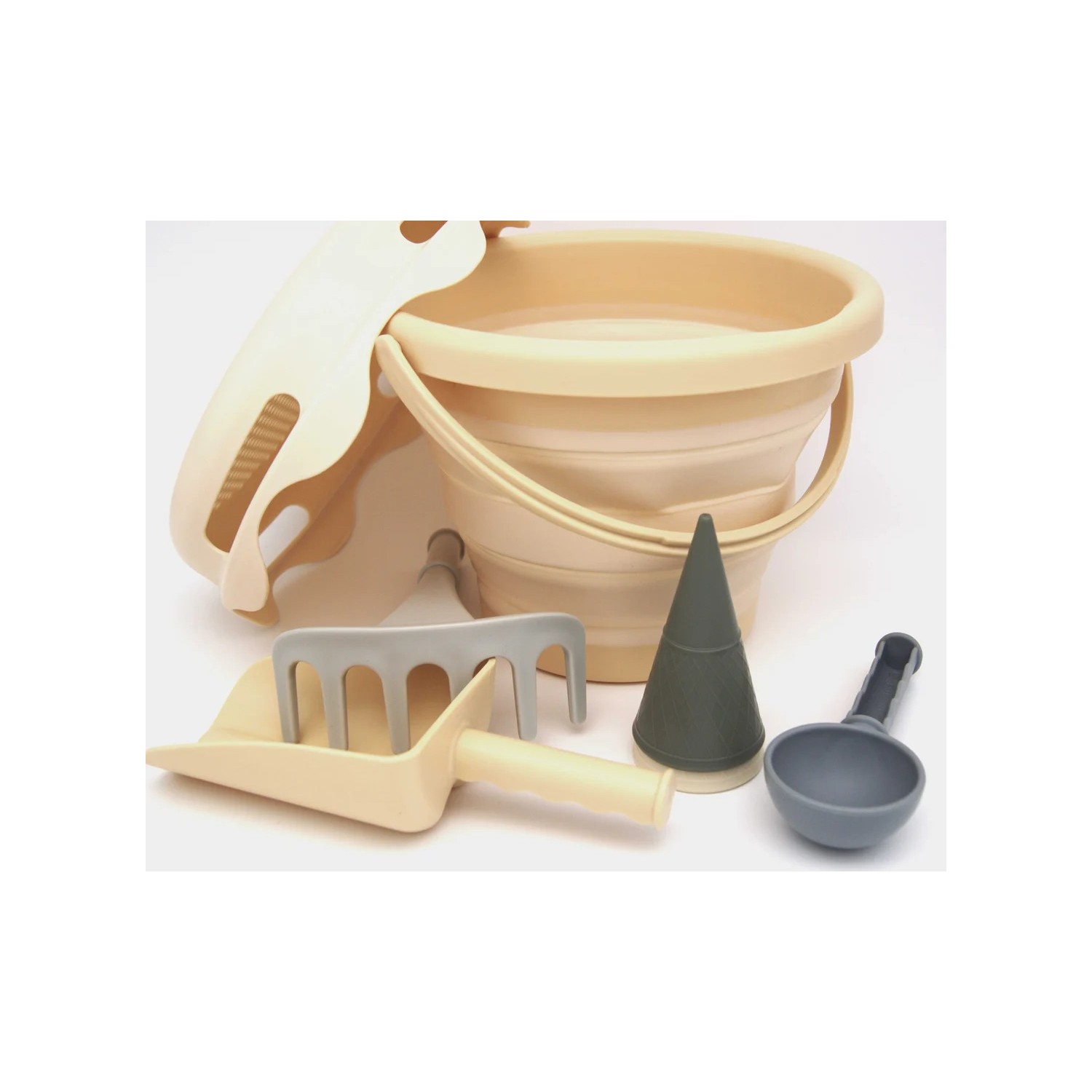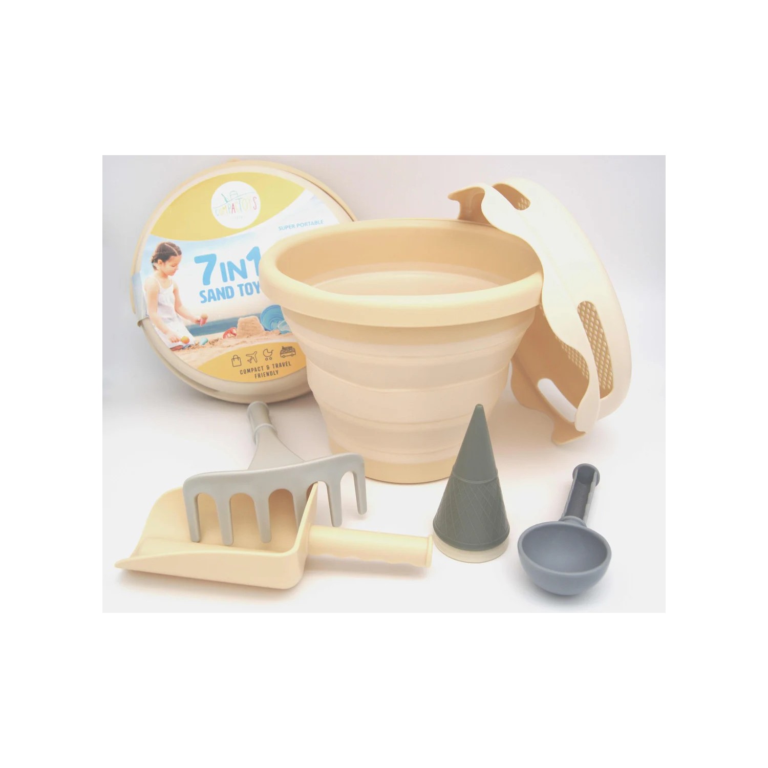 7in1 es un conjunto completo de juguetes de arena seleccionados para cavar, dar forma, tamizar, rastrillar y transportar en tamaño de bolso.