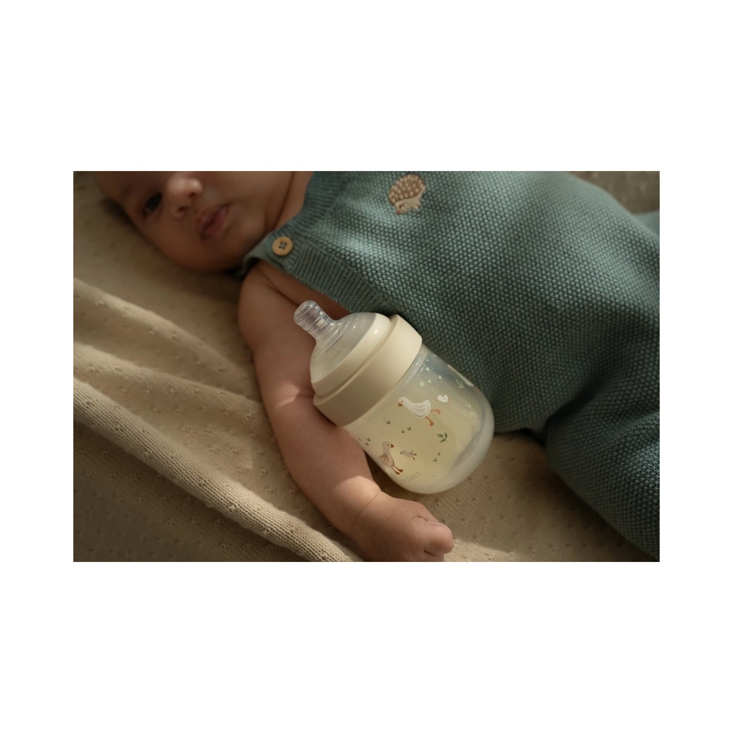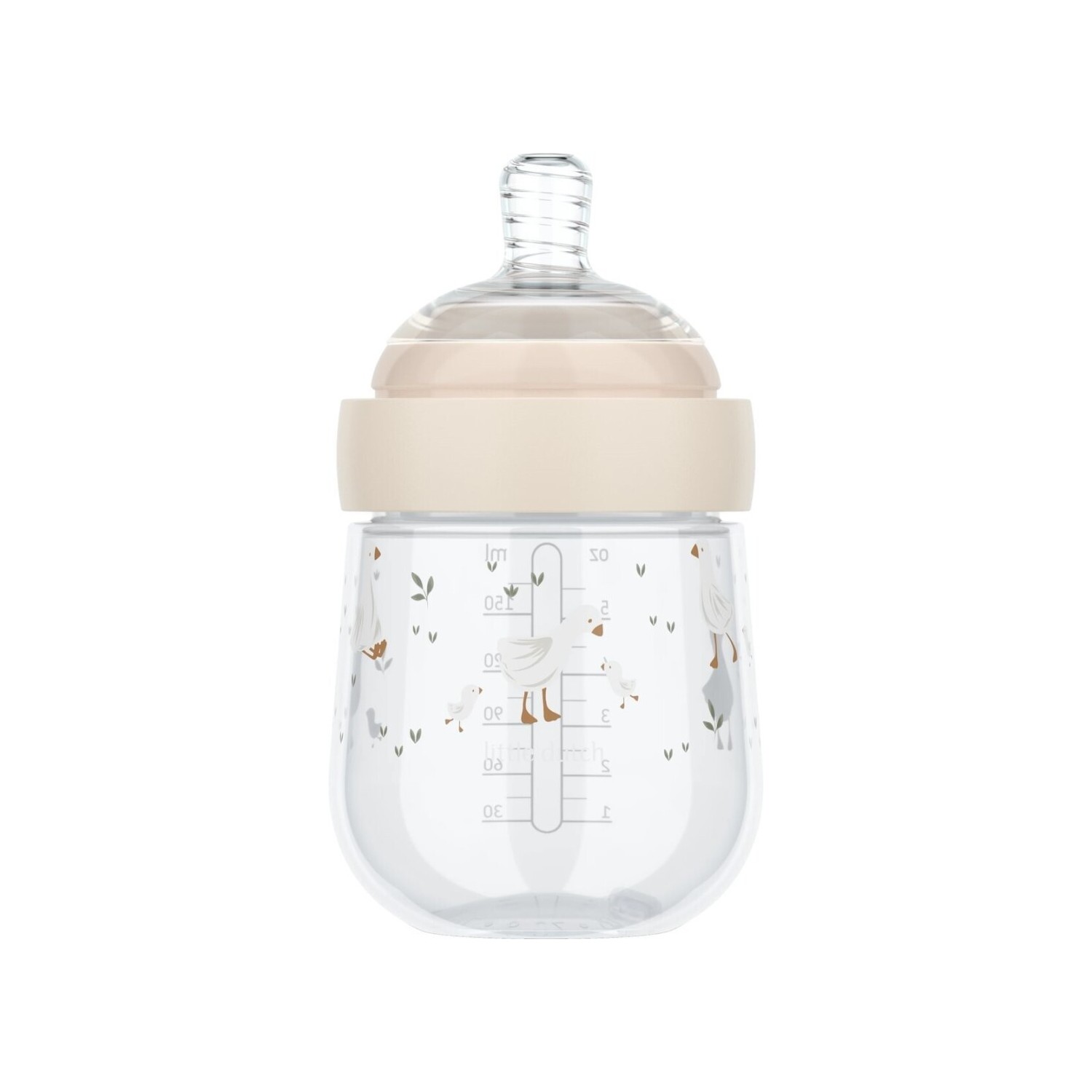 Biberón de 165 ml de la colección MIO, especialmente diseñado para evitar los cólicos, incluye tapa de sellado transparente para almacenar, el envase incluye medidas en ml y oz, libre de BPA.