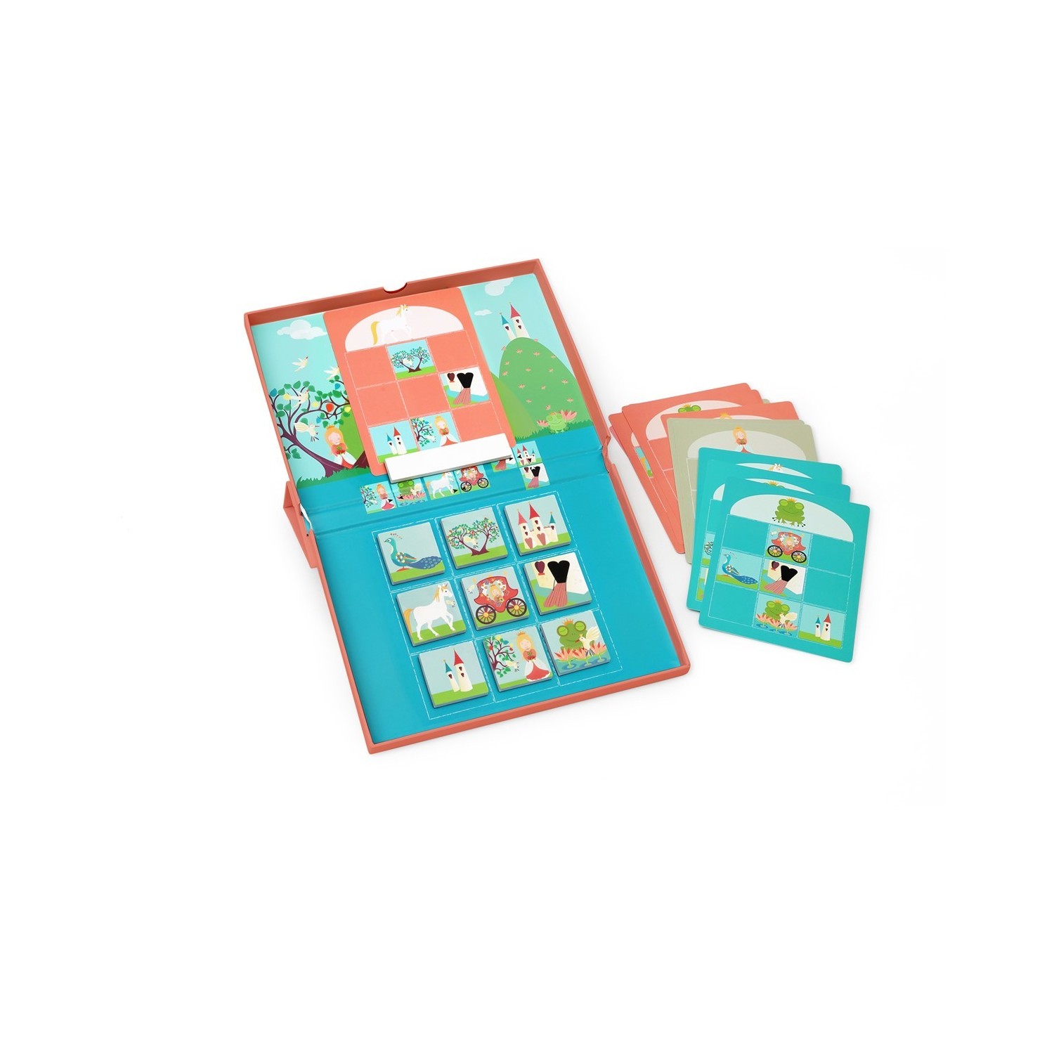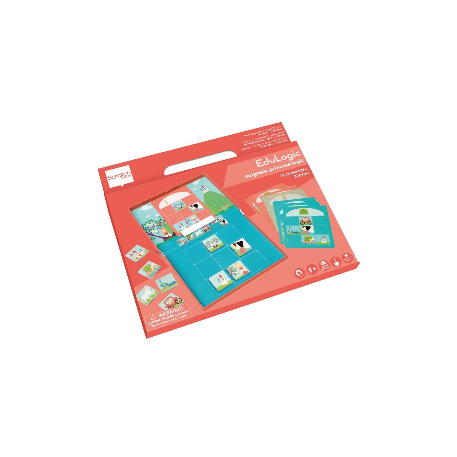 ¿Puedes completar el dibujo con princesas, unicornios y castillos añadiendo las figuras que faltan? Tenga en cuenta: ¡las figuras dentro de la caja siempre deben colocarse juntas de la manera correcta! Hay 18 tarjetas de tareas diferentes. Tome una tarjeta de tareas y péguela con el imán en la parte superior de la Edulogic Box. Copie la tarjeta de tarea con las cifras correctas en la parte inferior. Utilice las fichas magnéticas para esto. Ahora intente llenar los espacios vacíos en la tarjeta de tareas encontrando las cifras correctas que faltan. Mira la serie en el medio de la caja de Edulogic.