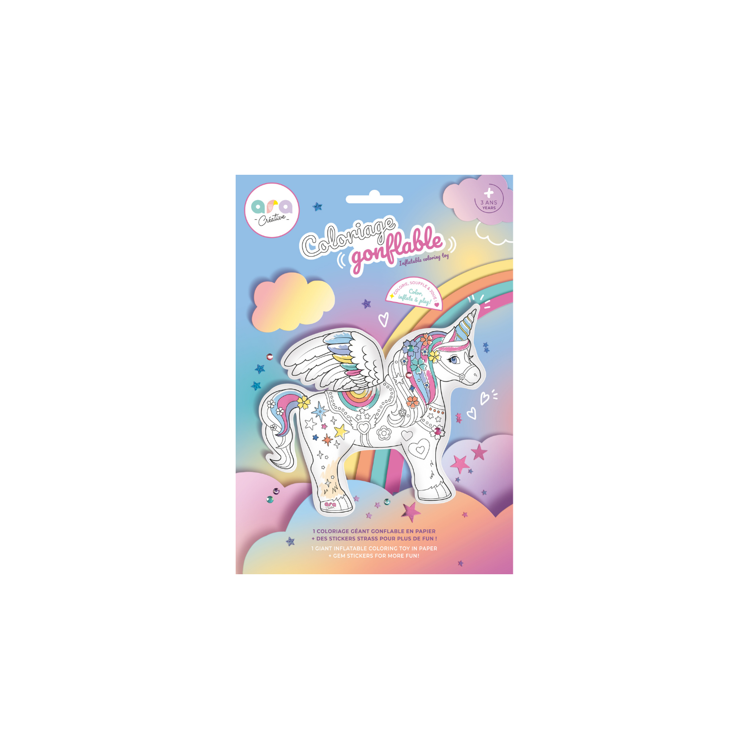 Contiene 1 inflable gigante de unicornio + pegatinas brillantes.