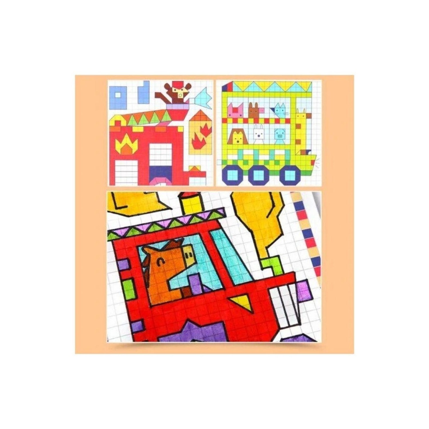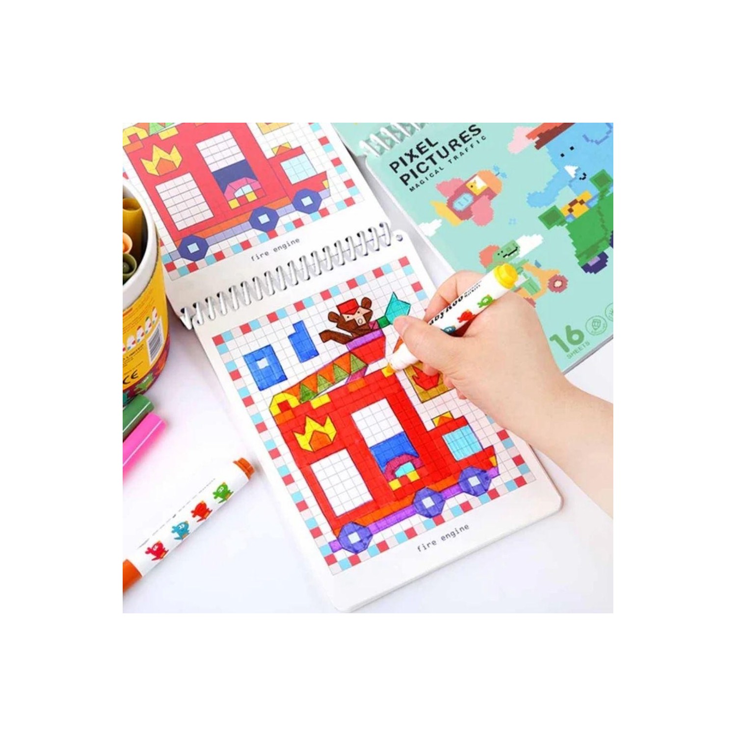 A partir de plantillas de píxeles predefinidas, los niños colorean cada cuadrado siguiendo el patrón y van dando forma, poco a poco, a ilustraciones inspiradas en el mundo del tráfico y los vehículos. El resultado aparece paso a paso, reforzando la observación y la atención al detalle.