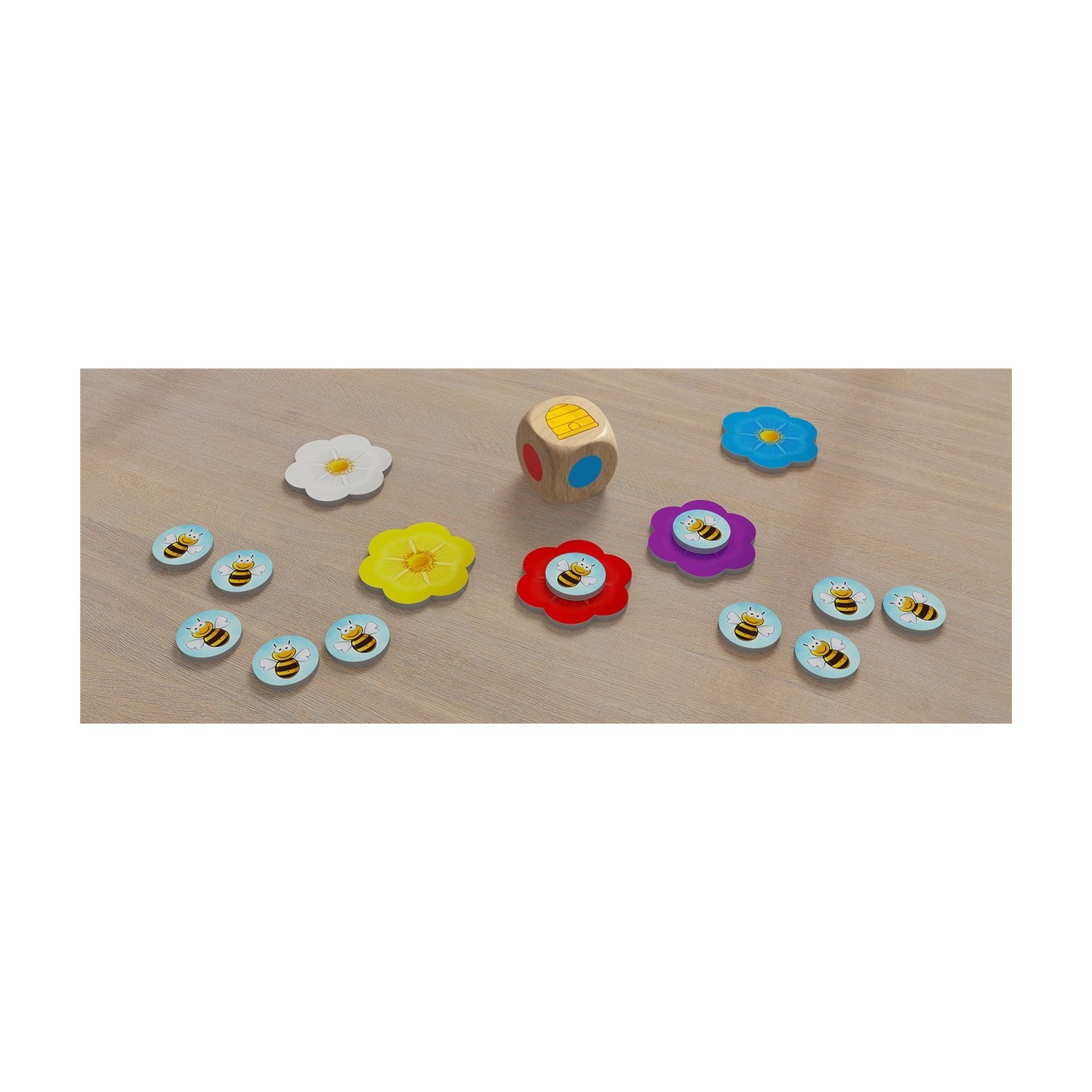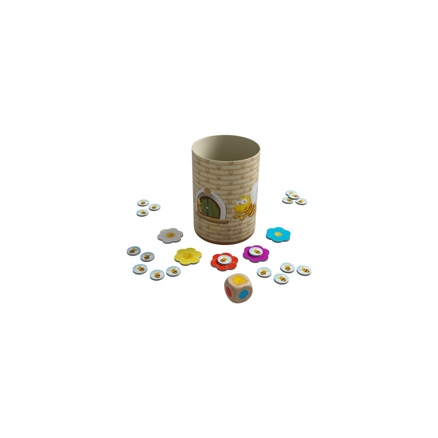En este juego debemos lograr que todas nuestras abejas sean las primeras en volar hasta la colmena (el cubilete) o hasta las flores. Para ello, por turnos se lanza el dado de colores y en función del color resultante podremos desplazar una de nuestras abejas o deberemos dejarlas donde están.