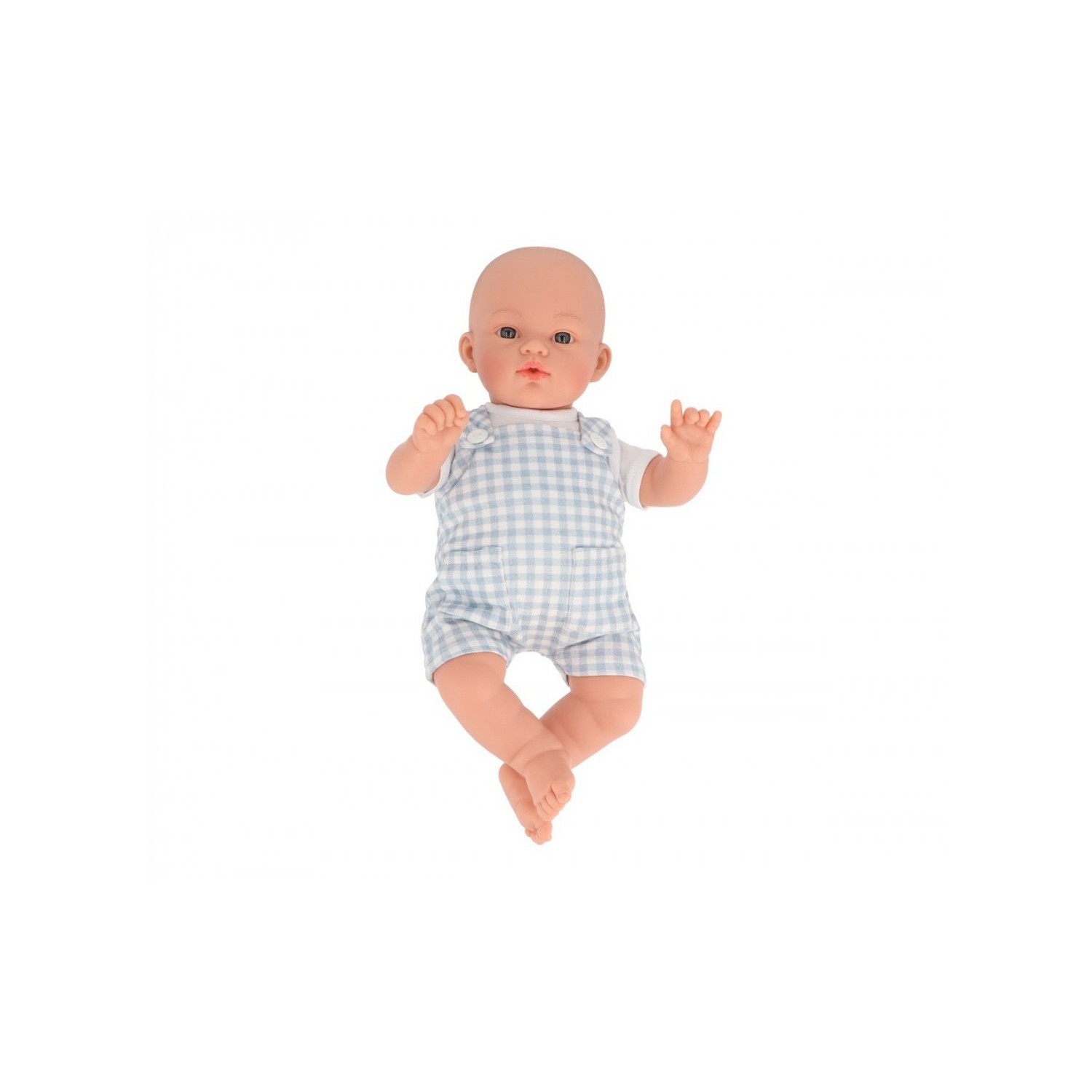 El adorable muñeco Mateo de cuerpo blandito soft, viene vestido con un peto y una camiseta.