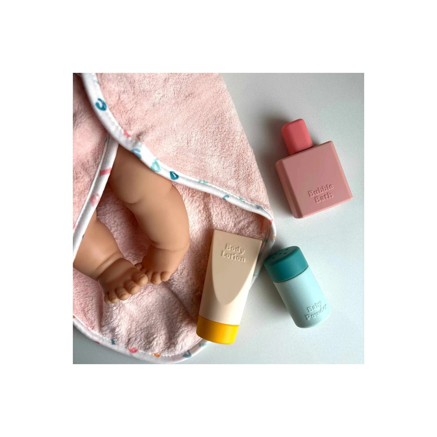 El set incluye una loción corporal, polvos de bebé, jabón de burbujas, una suave toalla con capucha y un encantador bolsito tote, perfecto para guardar todos los accesorios. Los pequeños podrán recrear rituales de baño, preparar a su muñeca para dormir o jugar a cuidarla después del baño, desarrollando habilidades de empatía, responsabilidad y creatividad.