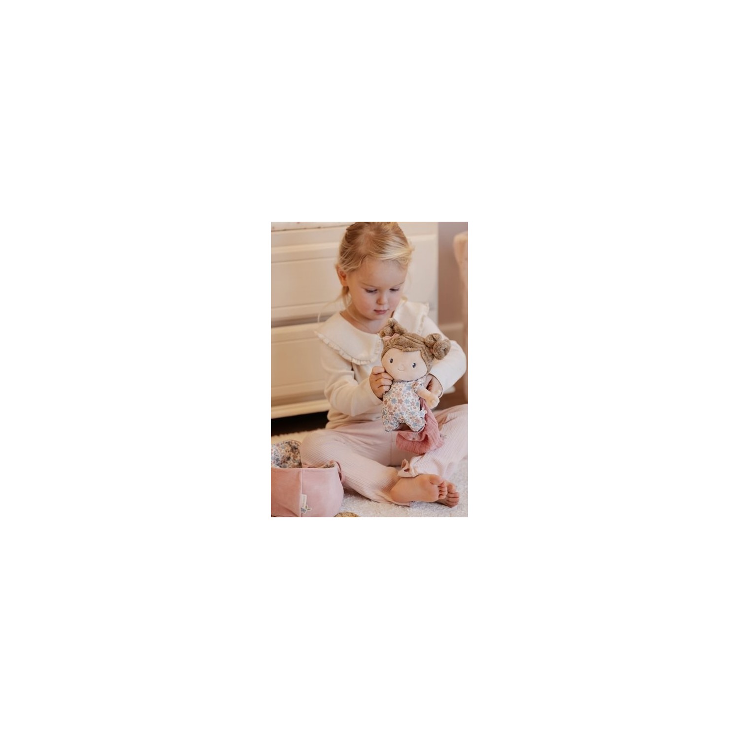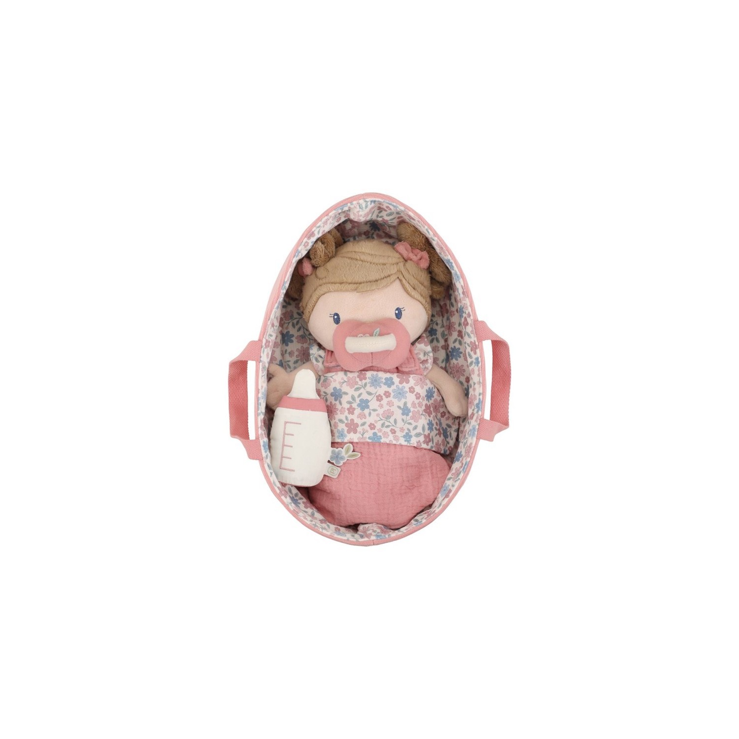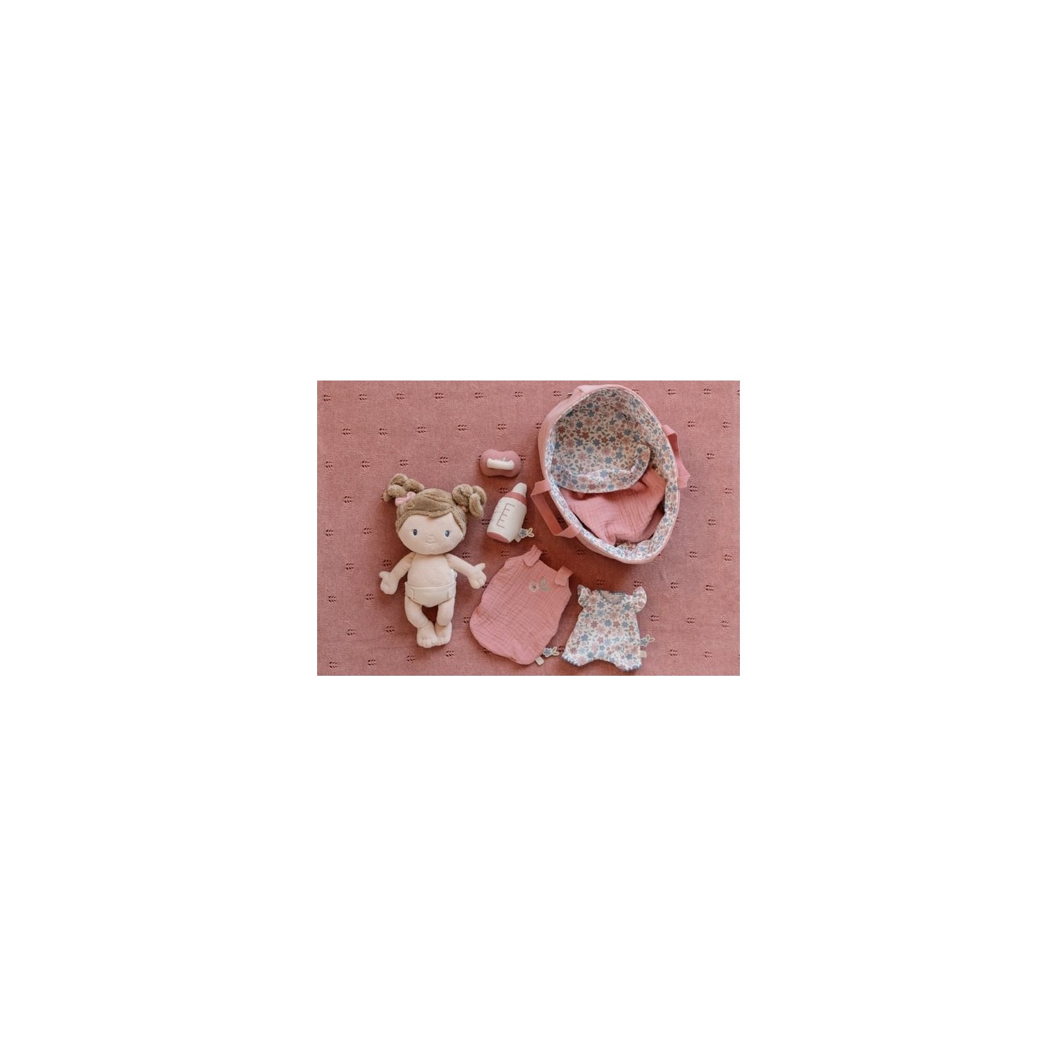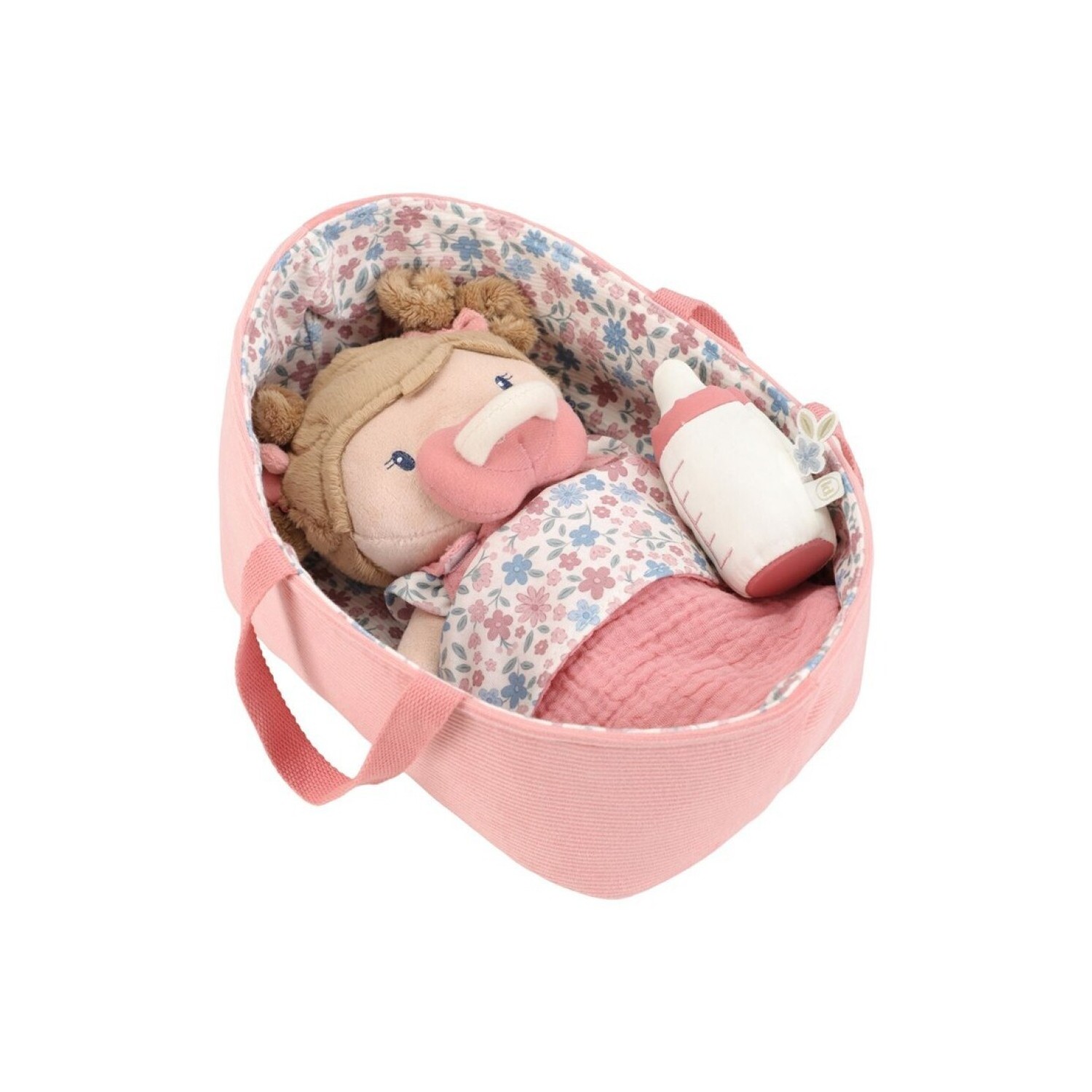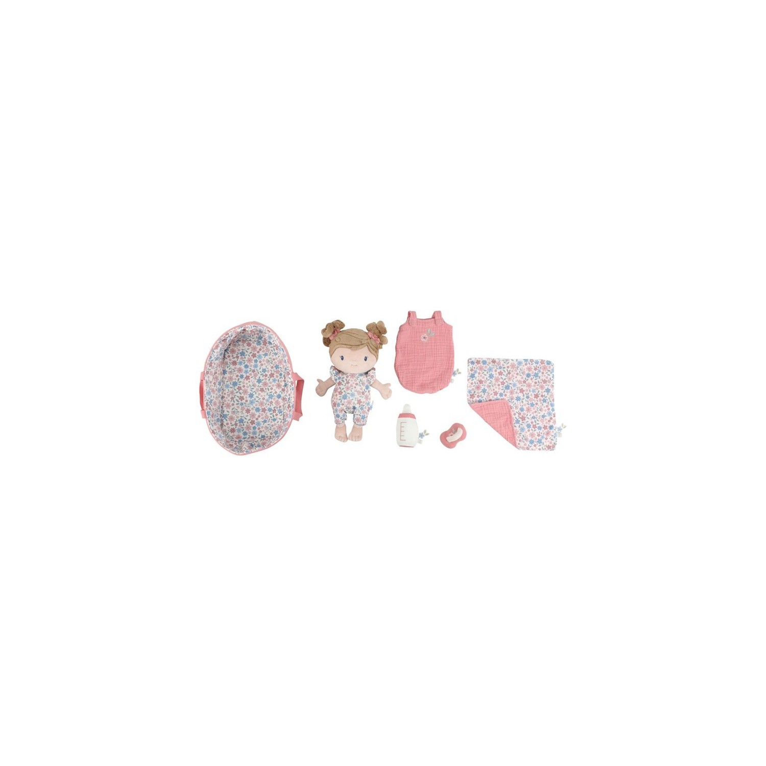 Conoce a la muñeca Rosa en su suave canastilla de viaje. Con su adorable saco de dormir, pelele y pañal ponible, Rosa invita a jugar con cariño. El chupete y el biberón se adhieren a su boca gracias a un imán. La canastilla acanalada con estampado floral y la manta a juego completan el conjunto. ¡Perfecta para llevarla a todas partes!