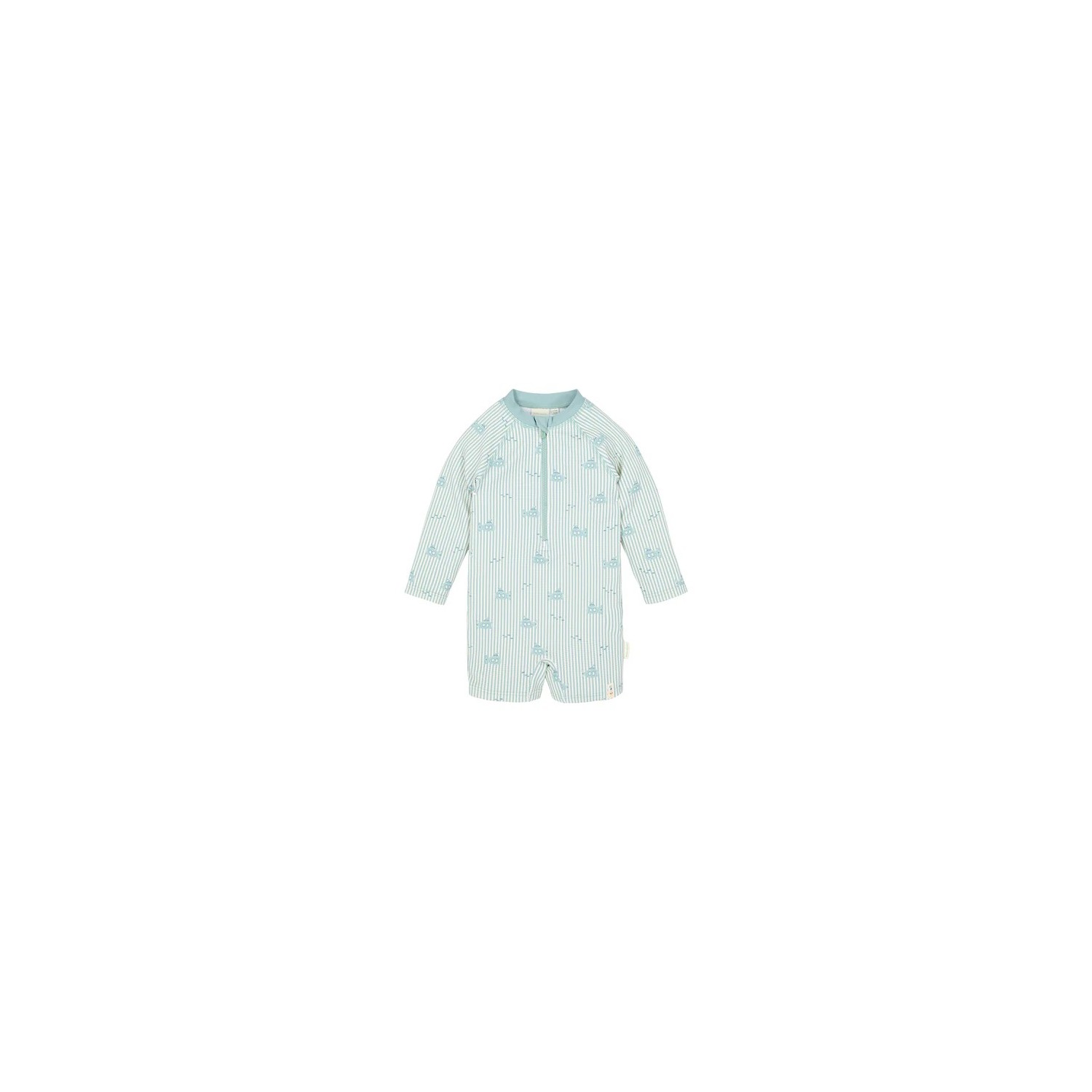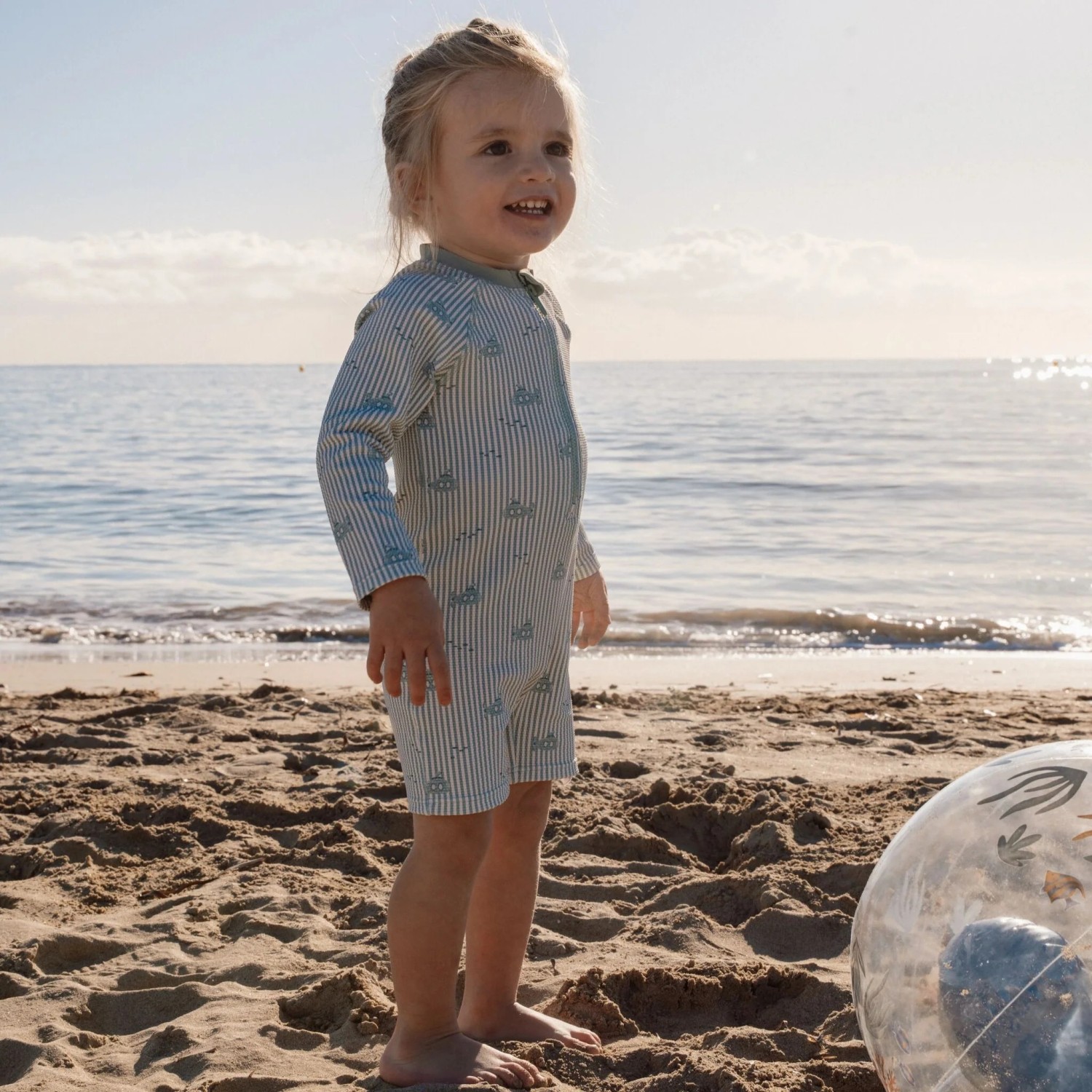 Este bañador de manga larga en verde es ideal para que los más pequeños disfruten del agua con estilo y seguridad. Su diseño Ocean Adventure combina rayas suaves, peces y submarinos que invitan a la aventura .
