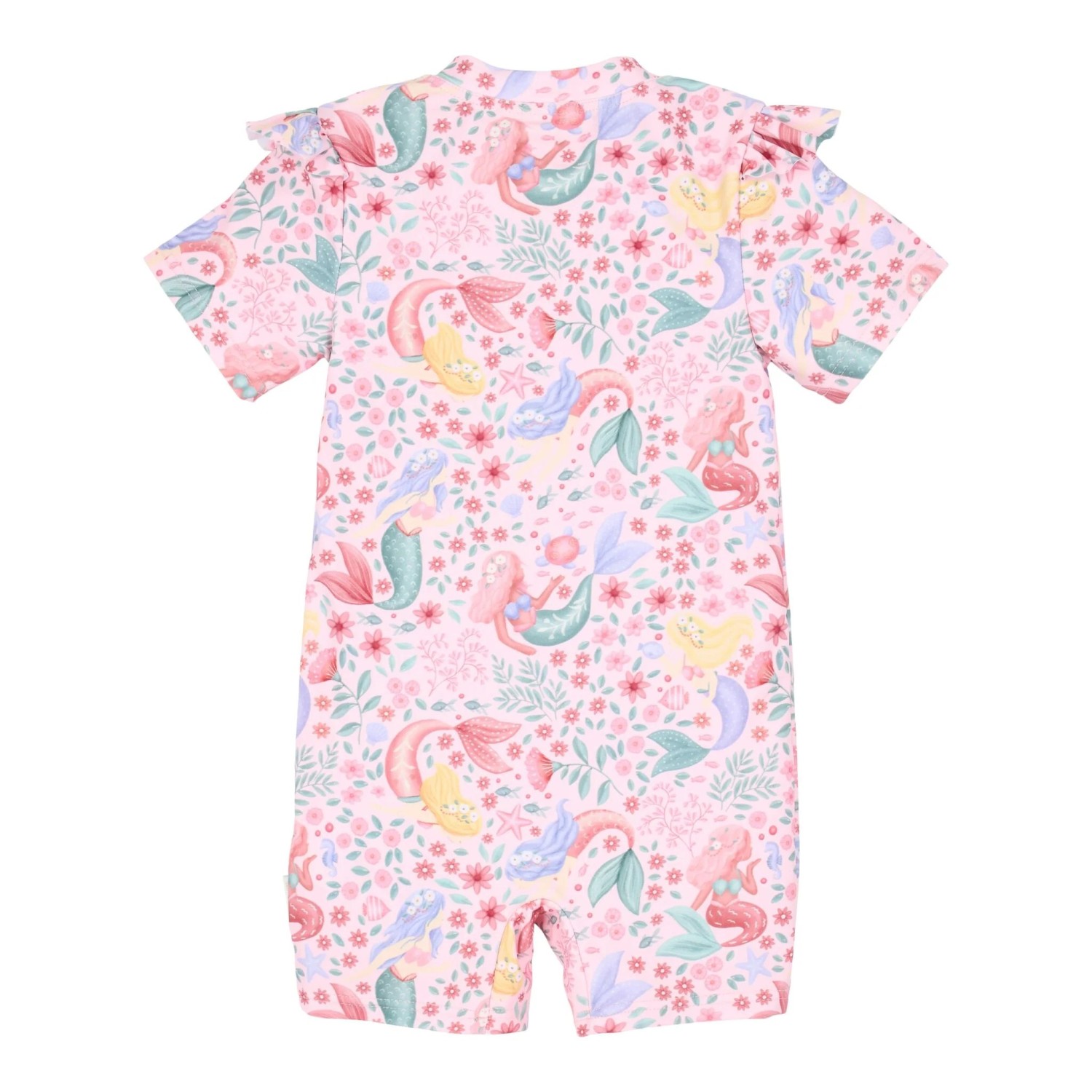 Estampado Mágico: Sobre un fondo rosa suave, presenta ilustraciones detalladas de sirenas, peces, conchas y estrellas de mar que invitan a la fantasía.