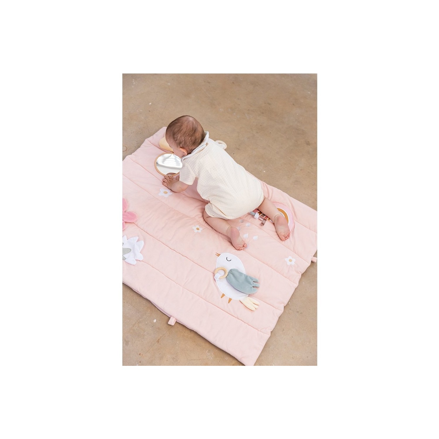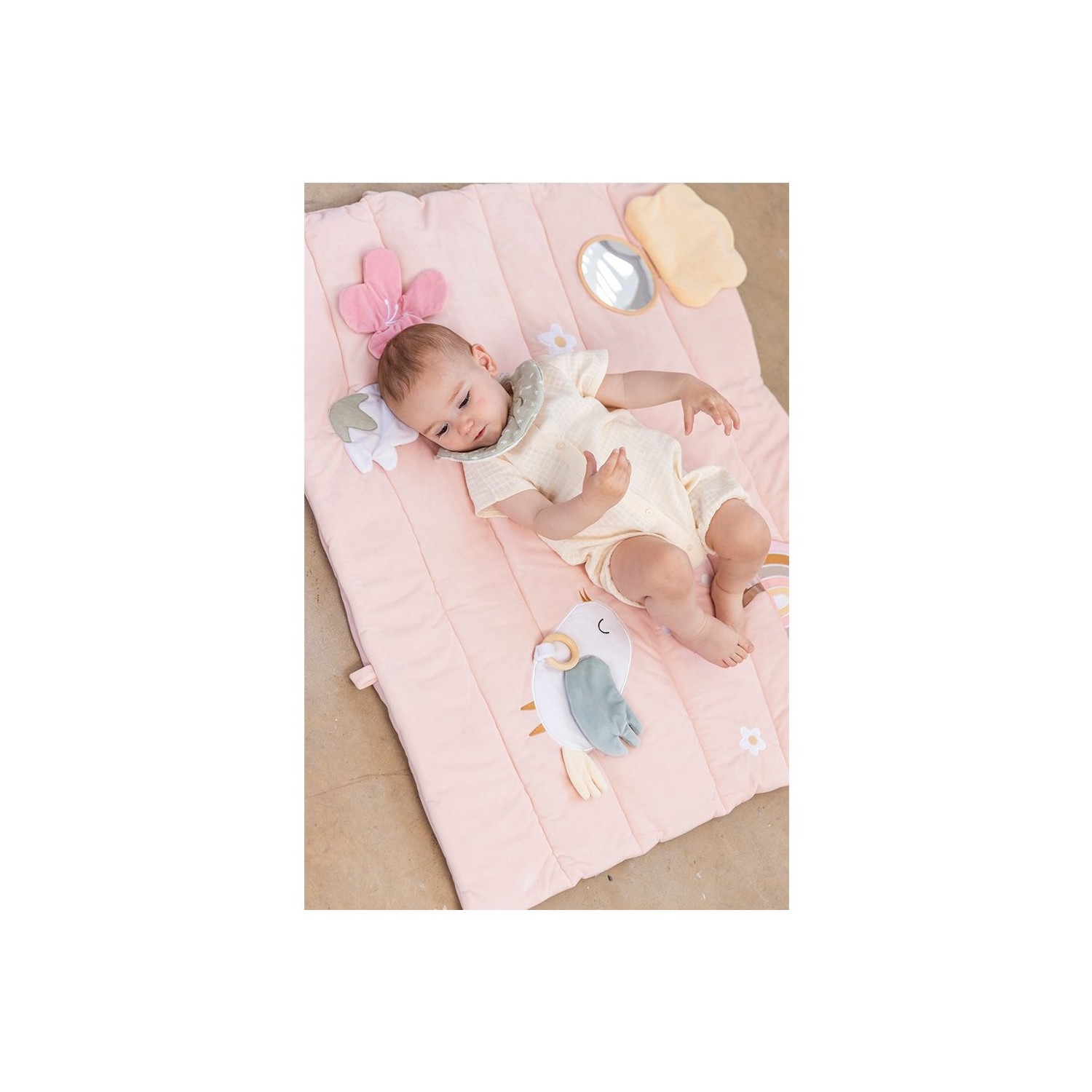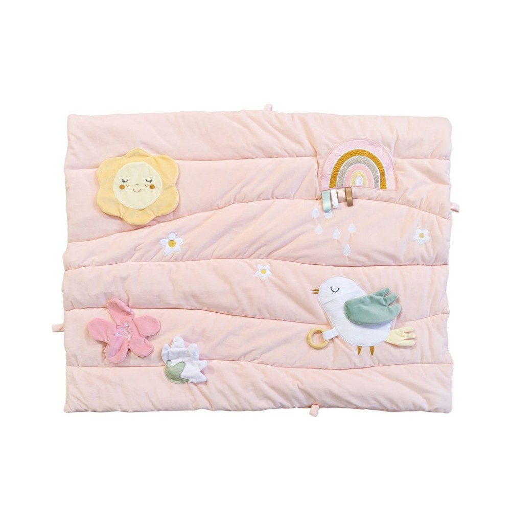 Esta preciosa manta de juegos acolchada Monnëka está llena de texturas y elementos que estimularán los sentidos de los peques. Hecha para horas de entretenimiento, los pequeños exploradores podrán ver y descubrir un espejo, etiquetas,diferentes texturas...
