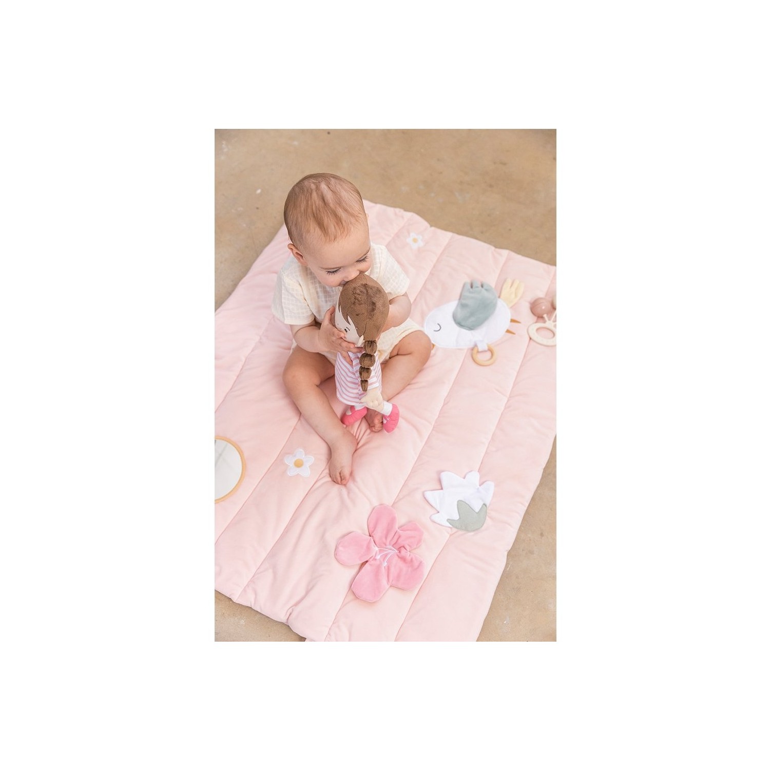 La manta de juegos les mantiene entretenidos y promueve el desarrollo de sus habilidades sensoriales como el tacto, la vista y el oído. Además favorece el desarrollo de la motricidad fina, gruesa y el libre movimiento.