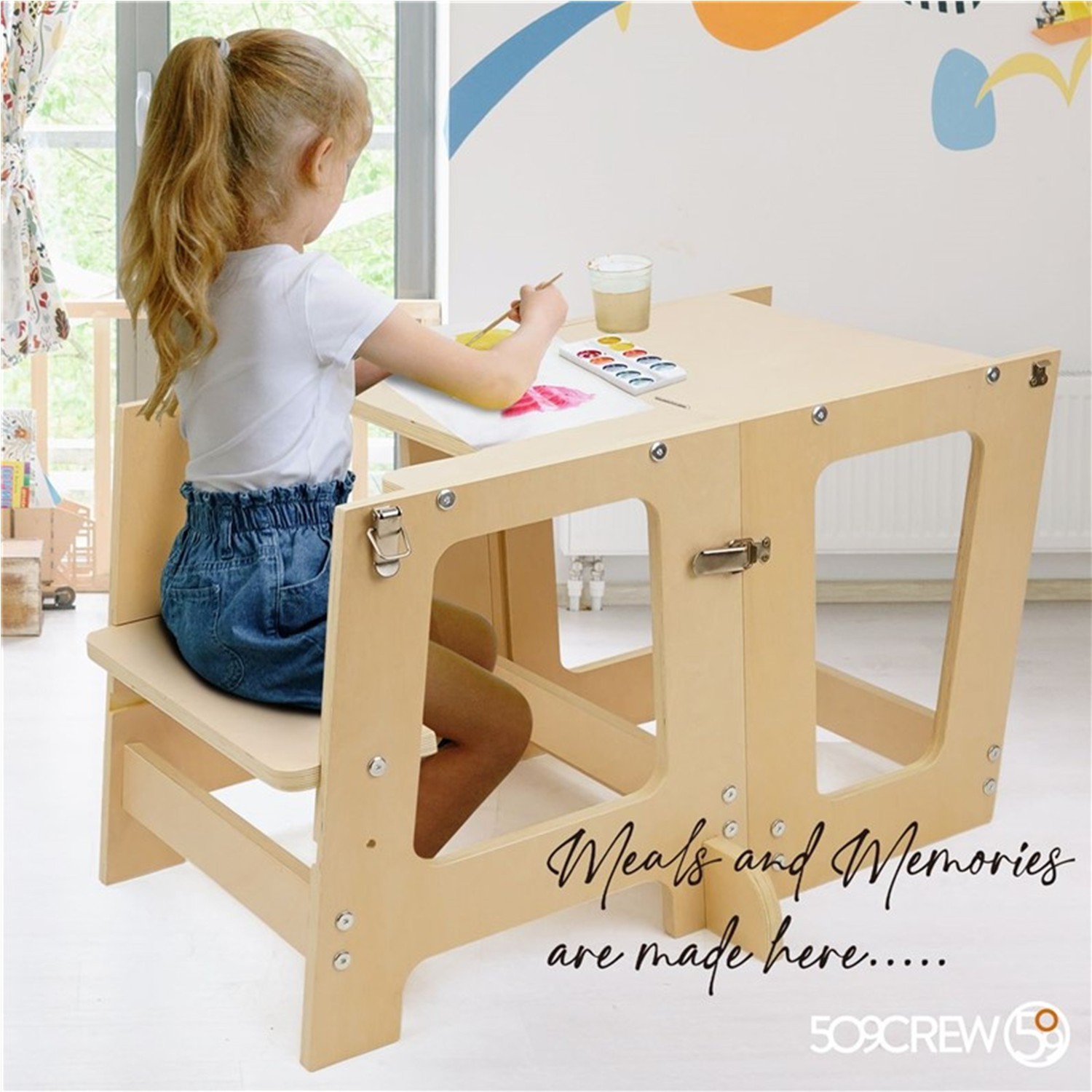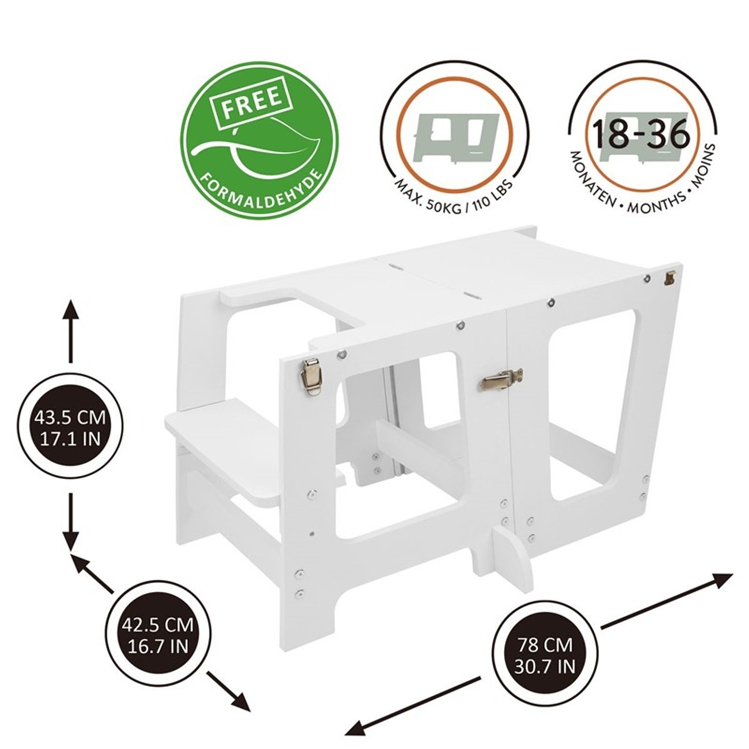 La Torre de aprendizaje PREMA 3 en 1 tiene múltiples usos, como Torre de aprendizaje, como escritorio con asiento y como torre con pizarra. tiene la altura justa para la mayoría de encimeras de las cocinas y de los muebles de lavabo de los cuartos de baño. Cuenta con un peldaño de seguridad ajustable en altura a 16,5 cm o 22,5 cm del suelo. La patas traseras tienen unos extensores para aumentar la estabilidad.