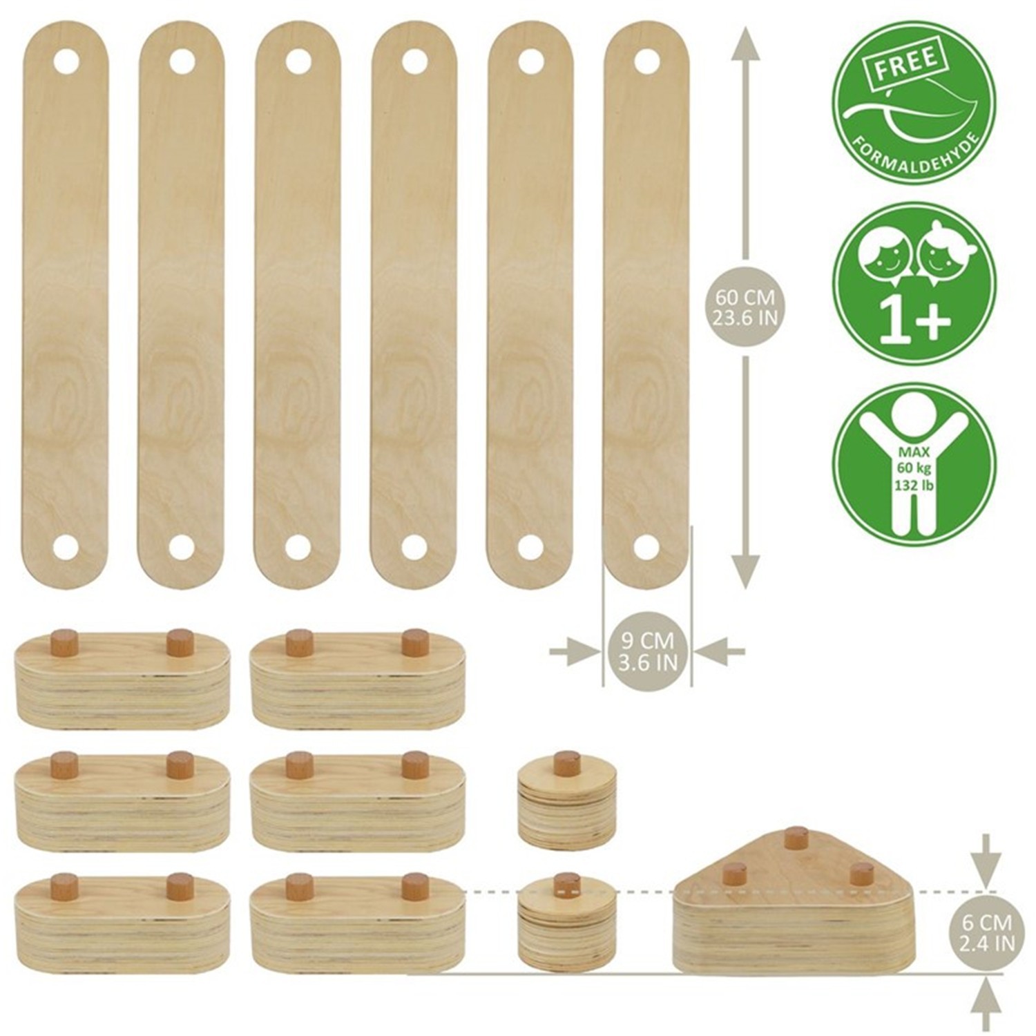 Crea tu propio circuito o estructura de equilibrio con este set de 15 piezas de madera. Cada listón de madera tiene una medida de 60 cm de largo y 9 cm de ancho. El set incluye: 6 listones de madera, 2 conectores individuales, 6 conectores dobles y 1 conector triple. tiene bordes redondeados con un acabado liso para que los niños estén cómodos y seguros durante el juego. Perfecto para jugar tanto dentro como fuera de casa. La plataforma aguanta un peso máximo de 60 kgs.