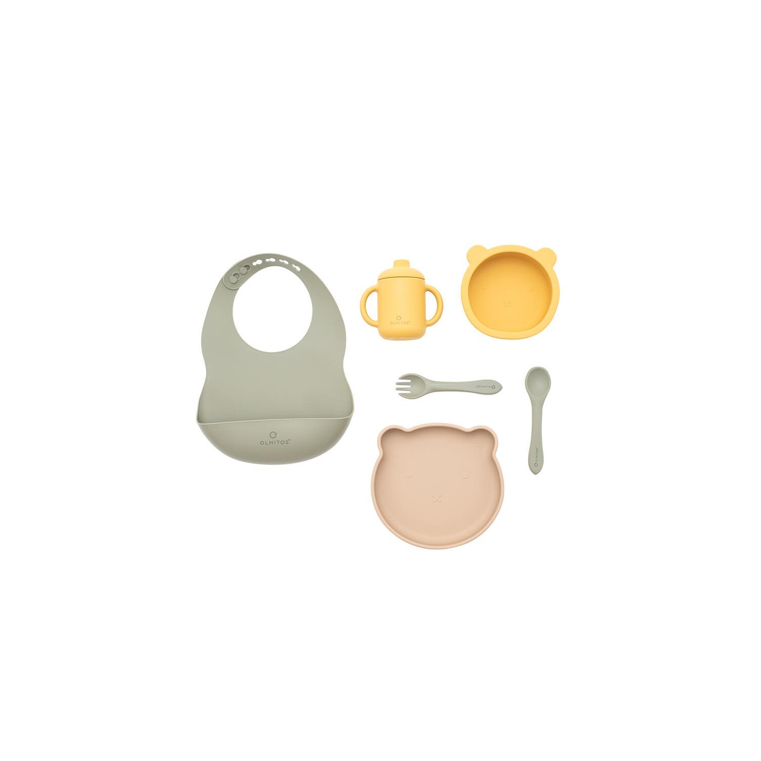 Contiene: Babero, plato, bol, cuchara, tenedor y vaso con boquilla. Silicona de alta calidad de grado alimenticio aprobada por LFGB.