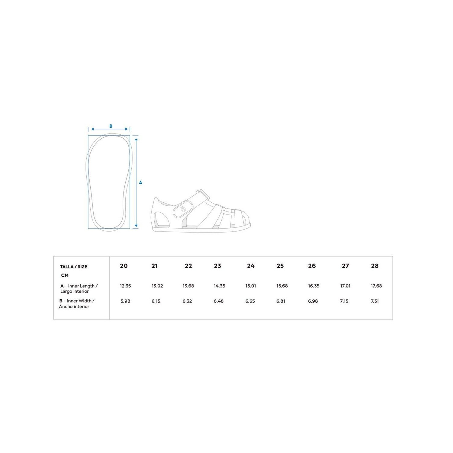 • ATENCIÓN: Las medidas de la tabla corresponden a este modelo en concreto y de la suela interior del zapato. Puedes compararla con la medida del pie de tu peque