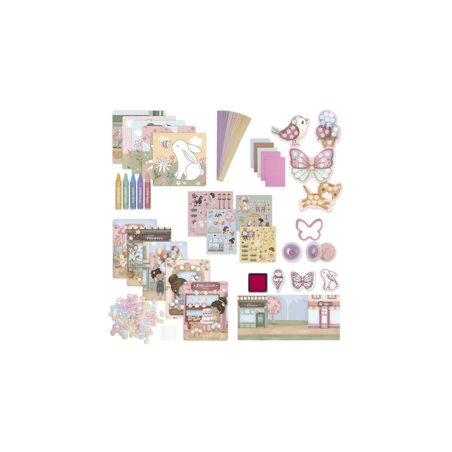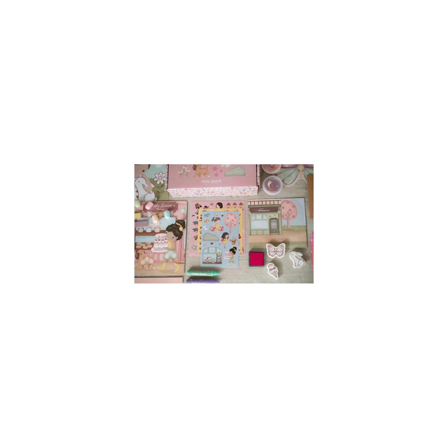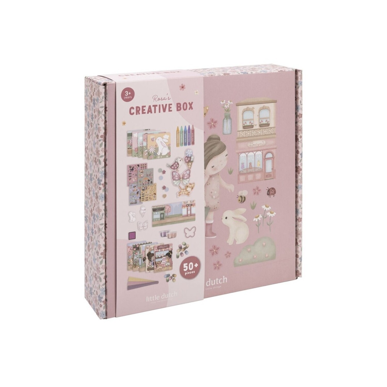 Caja de creativas inspirada en la muñeca Rosa , todo lo necesario para empezar a crear de forma inmediata. Ej: pegatinas, papel para dibujar, crayones de cera, foam para modelar, sellos...