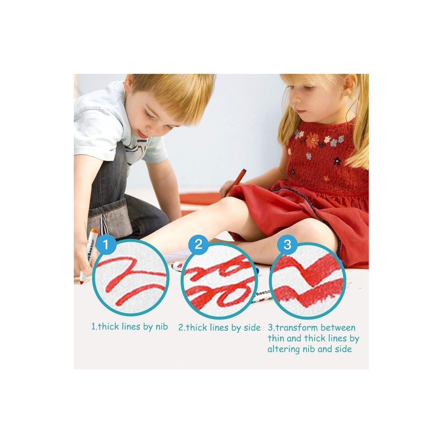 La punta cónica permite variar el grosor del trazo según el ángulo: líneas finas para detalles y trazos anchos para rellenar sin esfuerzo. Los colores son uniformes y fluidos, ideales para colorear, dibujar, garabatear y dar forma a proyectos en casa o en el aula.