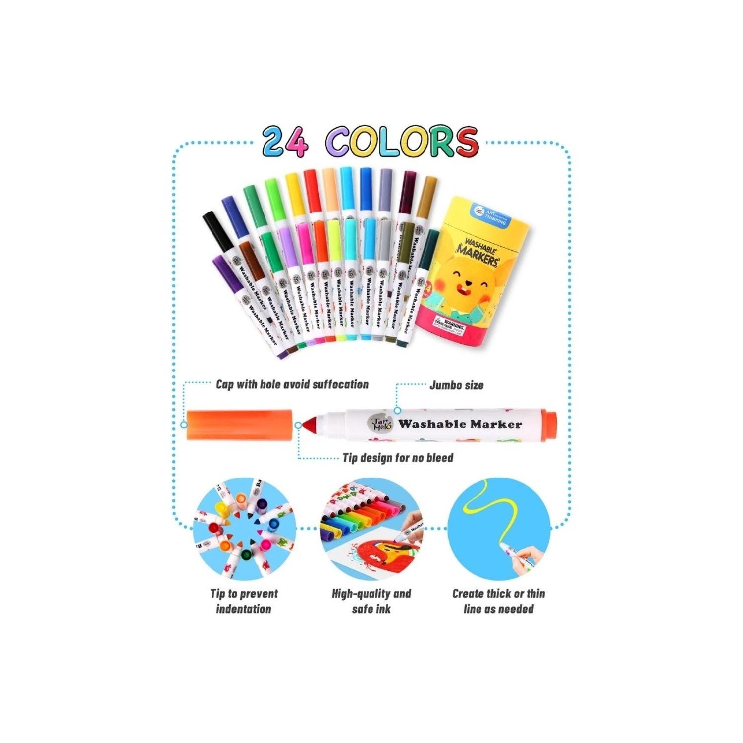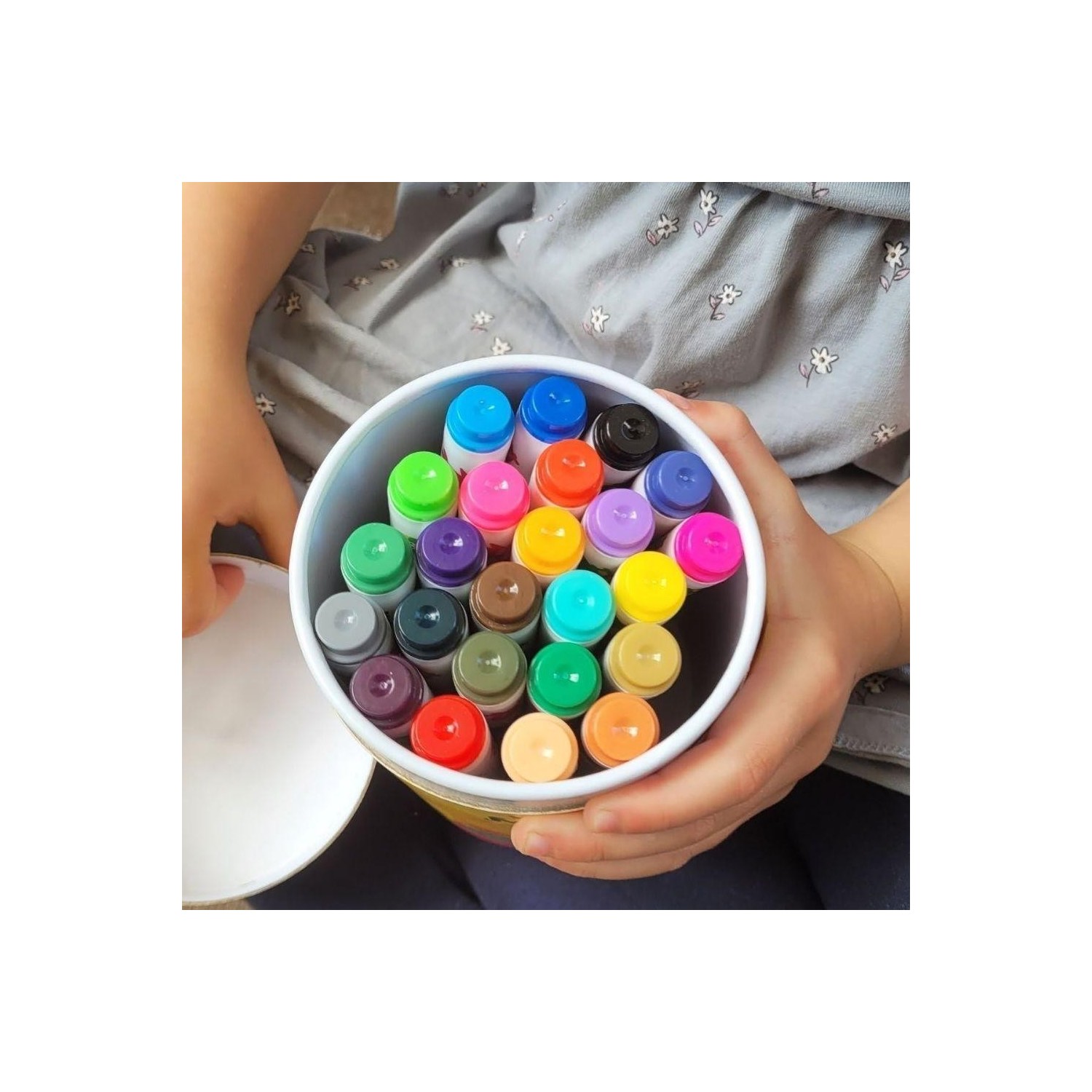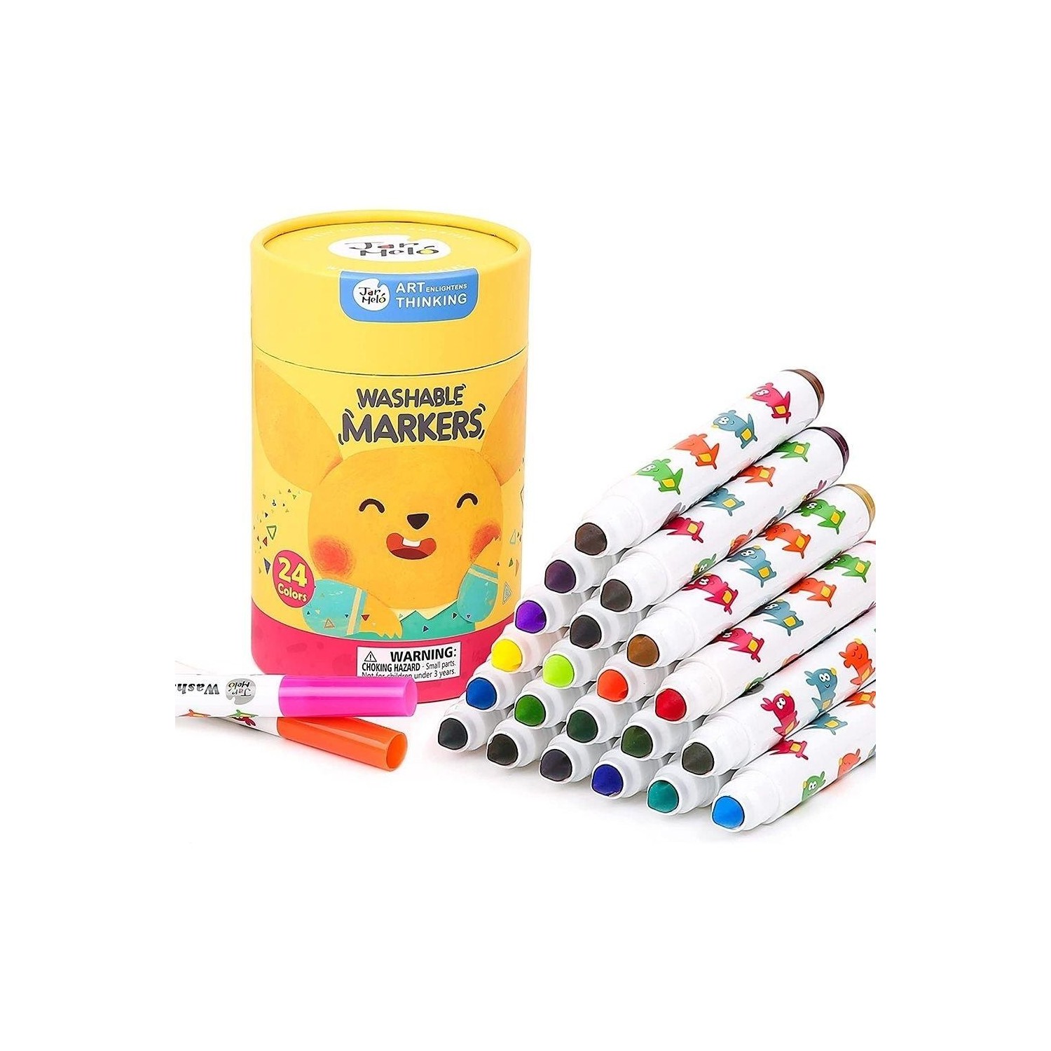 Bote con 24 rotuladores lavables Jarmelo diseñados para que los más pequeños dibujen y coloreen con comodidad, seguridad y libertad creativa. La forma ergonómica facilita el agarre de manos pequeñas y acompaña la autonomía desde el primer uso.