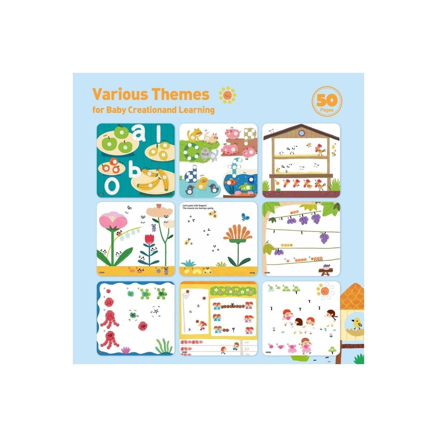 El libro combina páginas guiadas con temáticas variadas -alfabeto, números, formas, colores, clima, animales y plantas- junto con hojas en blanco que invitan a crear libremente, imaginar y experimentar sin instrucciones cerradas.