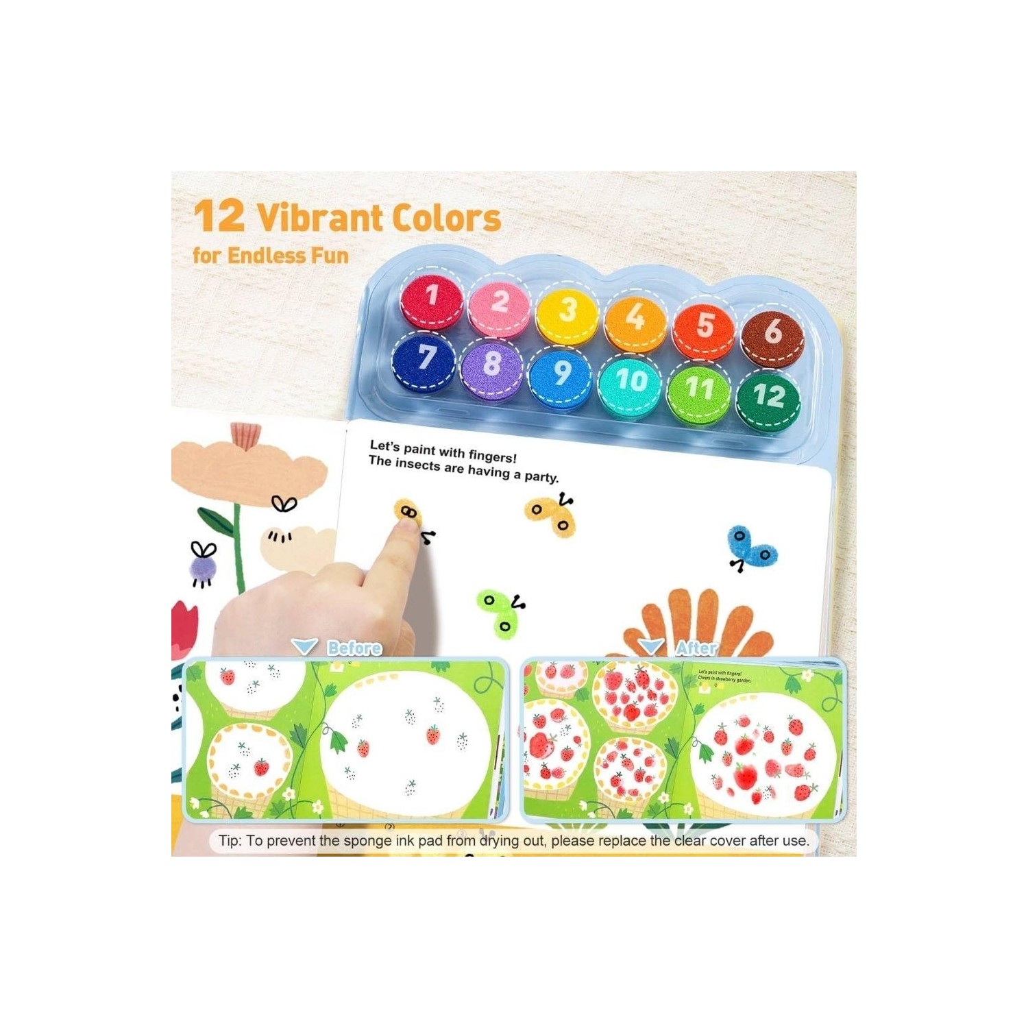A través de almohadillas de tinta con esponja en 12 colores vibrantes, los peques presionan suavemente con la yema de los dedos y completan escenas del bosque de forma intuitiva y divertida. Cada huella se transforma en hojas, animales o detalles que aparecen casi por sorpresa.
