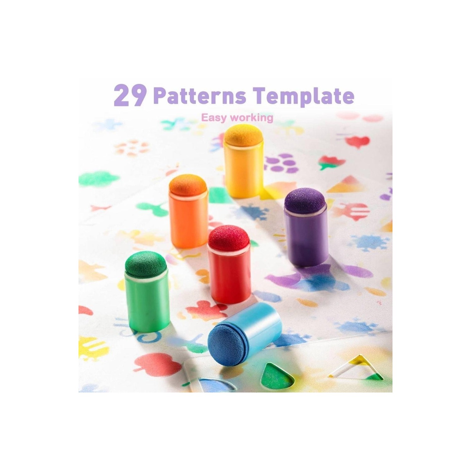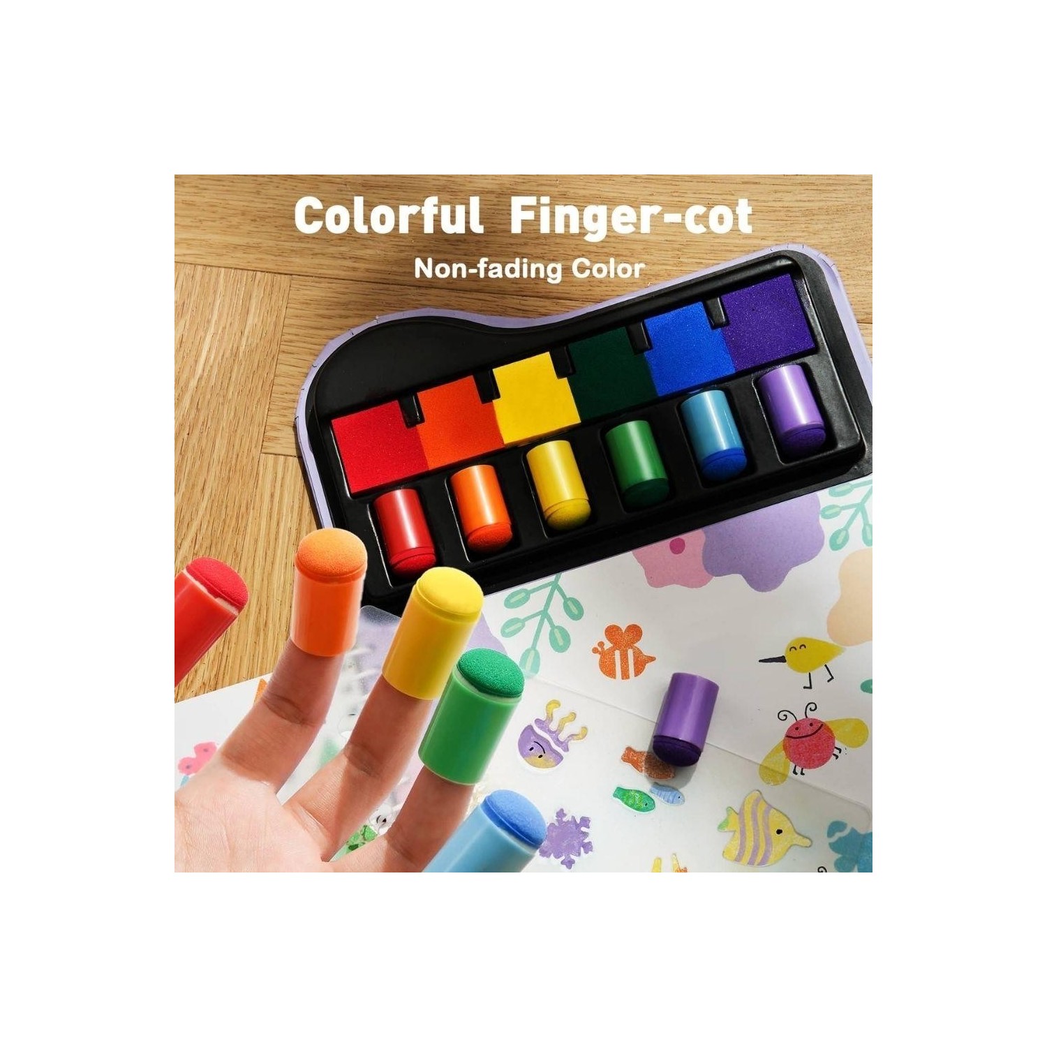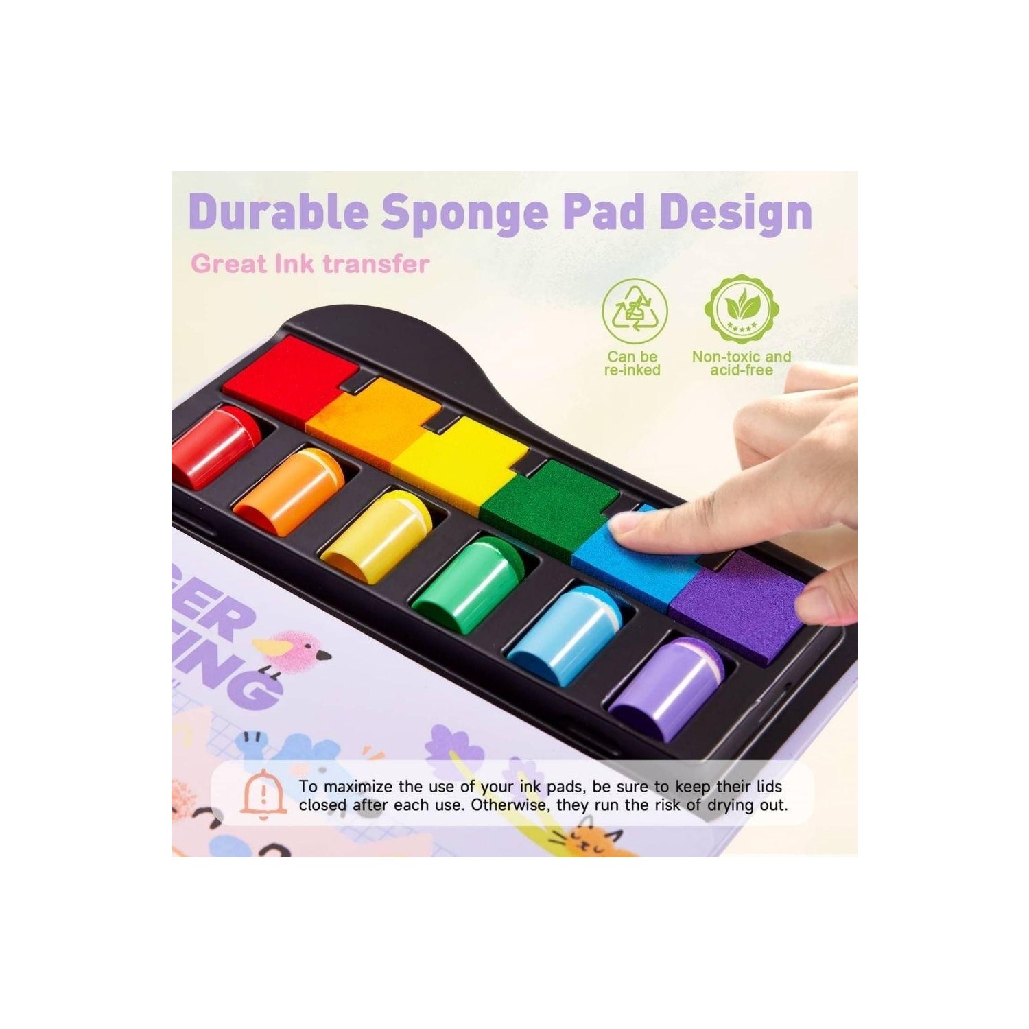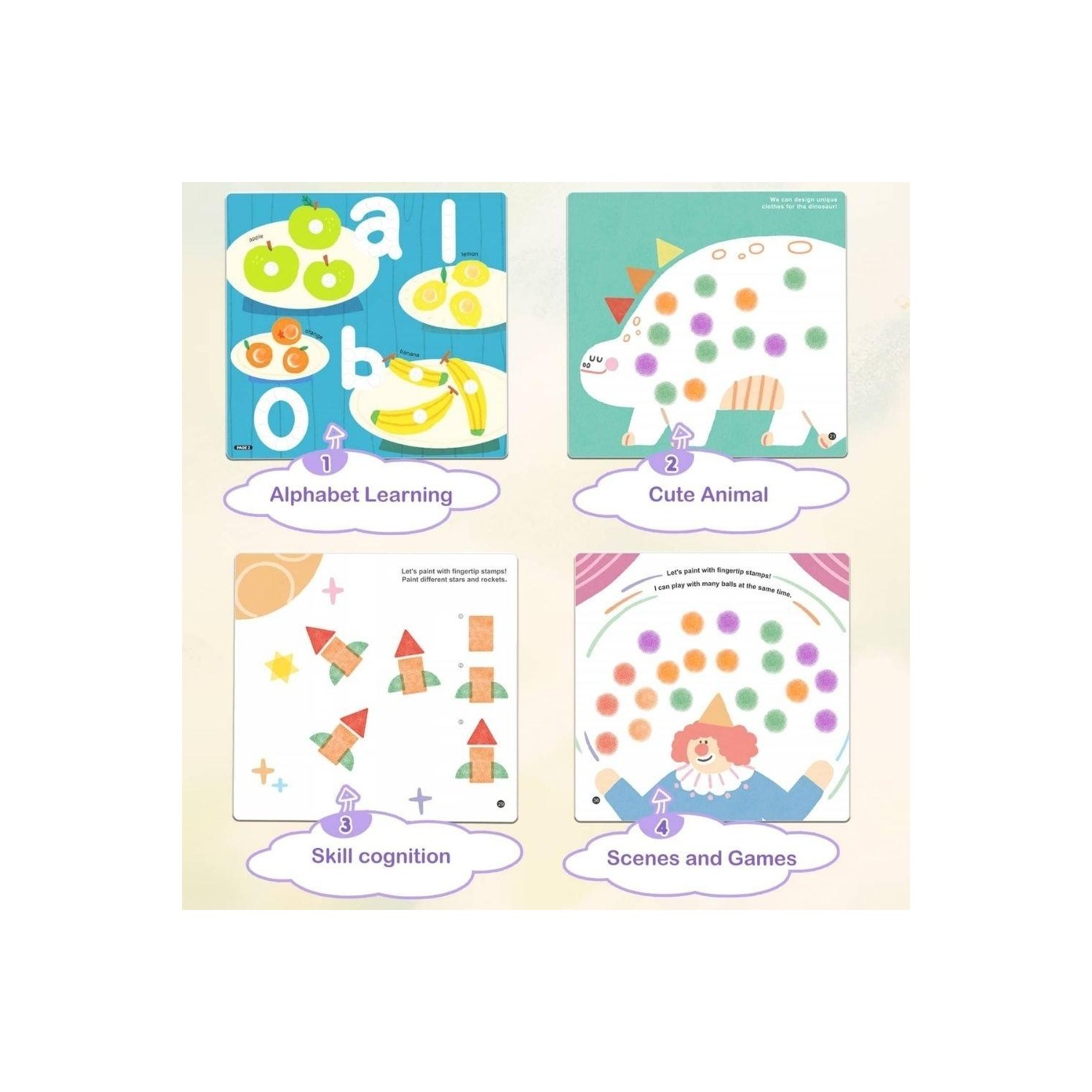 A través de almohadillas de tinta de colores, dedales y sellos, los niños crean patrones y escenas presionando suavemente sobre el papel. El sistema permite pintar sin mezclar colores y sin ensuciarse, ofreciendo una experiencia sensorial controlada, agradable y accesible para primeras exploraciones artísticas.