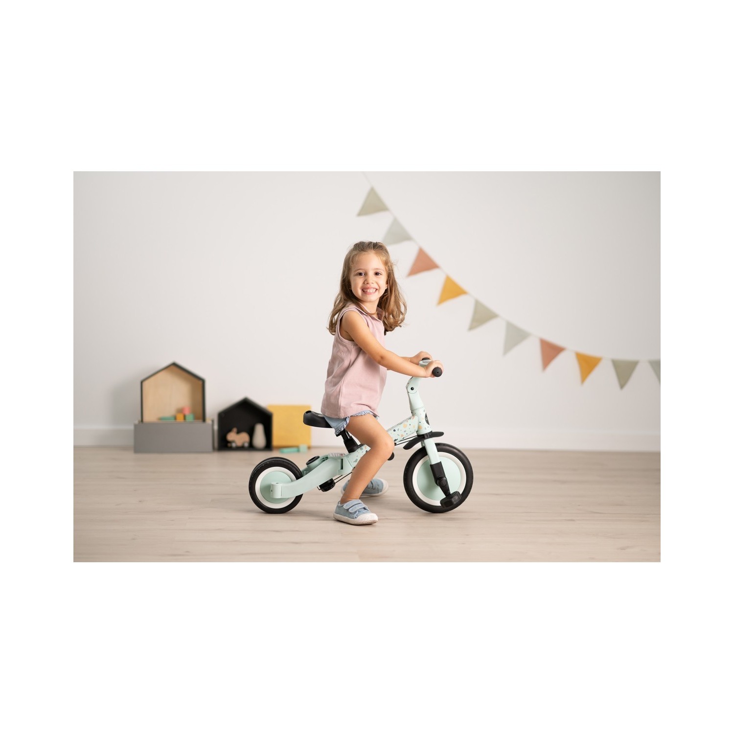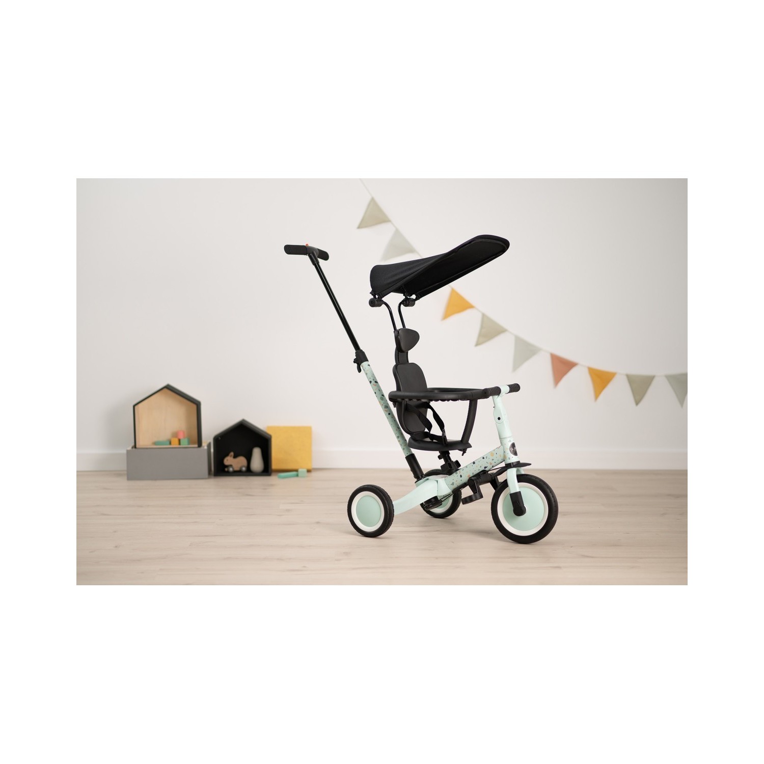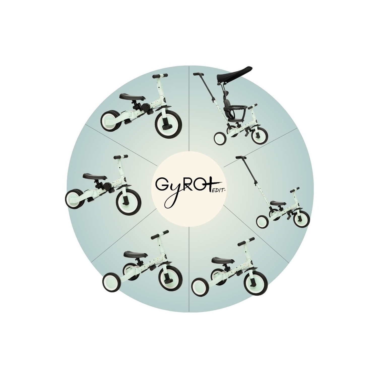 Diseñado para ofrecer la máxima comodidad y seguridad, incluye una práctica capota que protege a los más pequeños del sol para disfrutar de los paseos al aire libre sin preocupaciones. Además, su aro de protección añade una capa extra de seguridad para que el niño esté siempre seguro mientras explora su entorno. Y al igual que su hermano mayor Gyro, se adapta a las diferentes etapas del crecimiento del bebé, permitiendo su uso como triciclo guiado y, posteriormente, como triciclo y bici independiente.