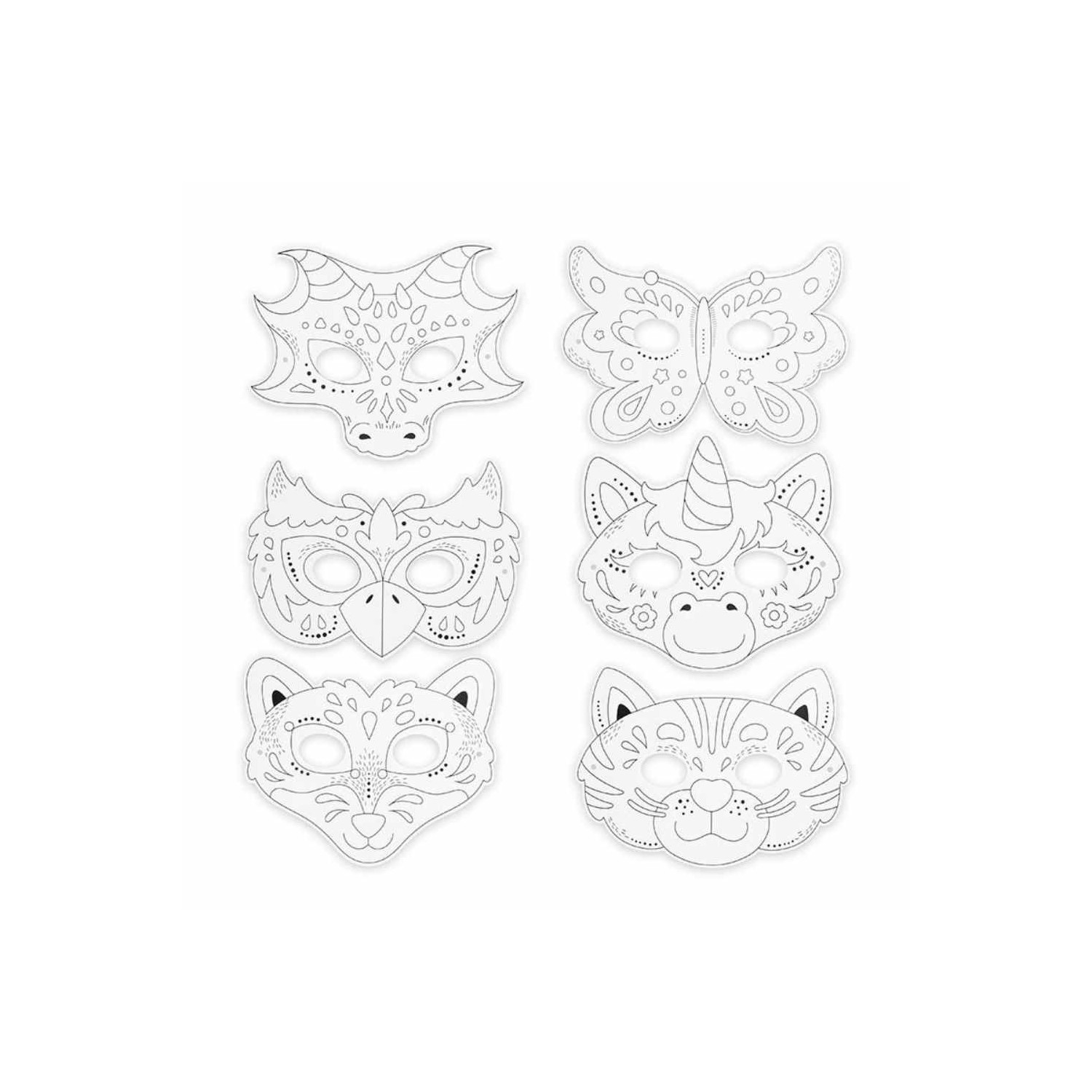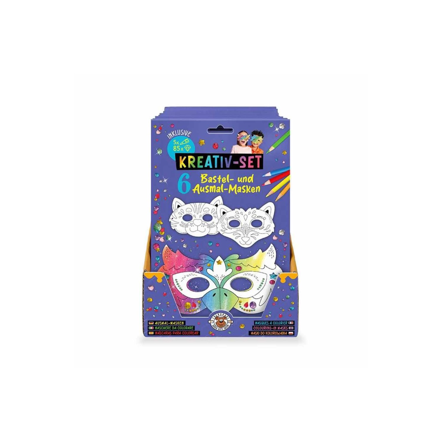 Contenido: 6 máscaras de papel de alta calidad con diferentes motivos de animales para colorear, goma elástica (4,2 m) para ajustar individualmente, 85 pegatinas de diamantes de colores y 5 lápices de colores.