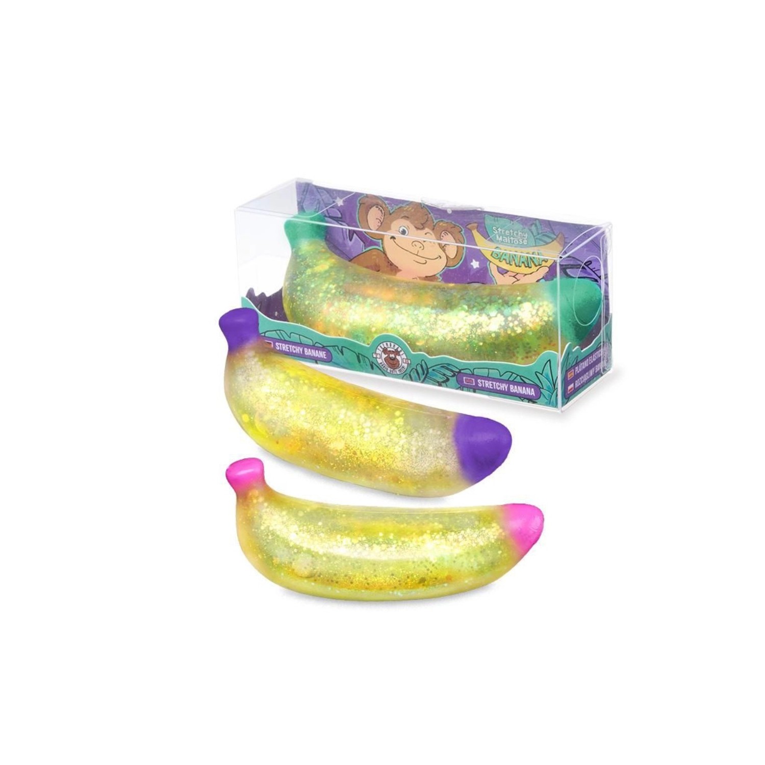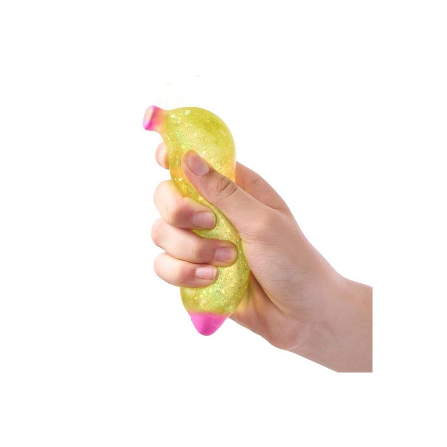 ¡Este plátano de maltosa con purpurina es perfecto para apretar y estrujar! Las partículas de purpurina y su agradable tacto lo convierten en un efectivo antiestrés que no querrás soltar. Incluye caja de regalo con agujero para tocarlo.